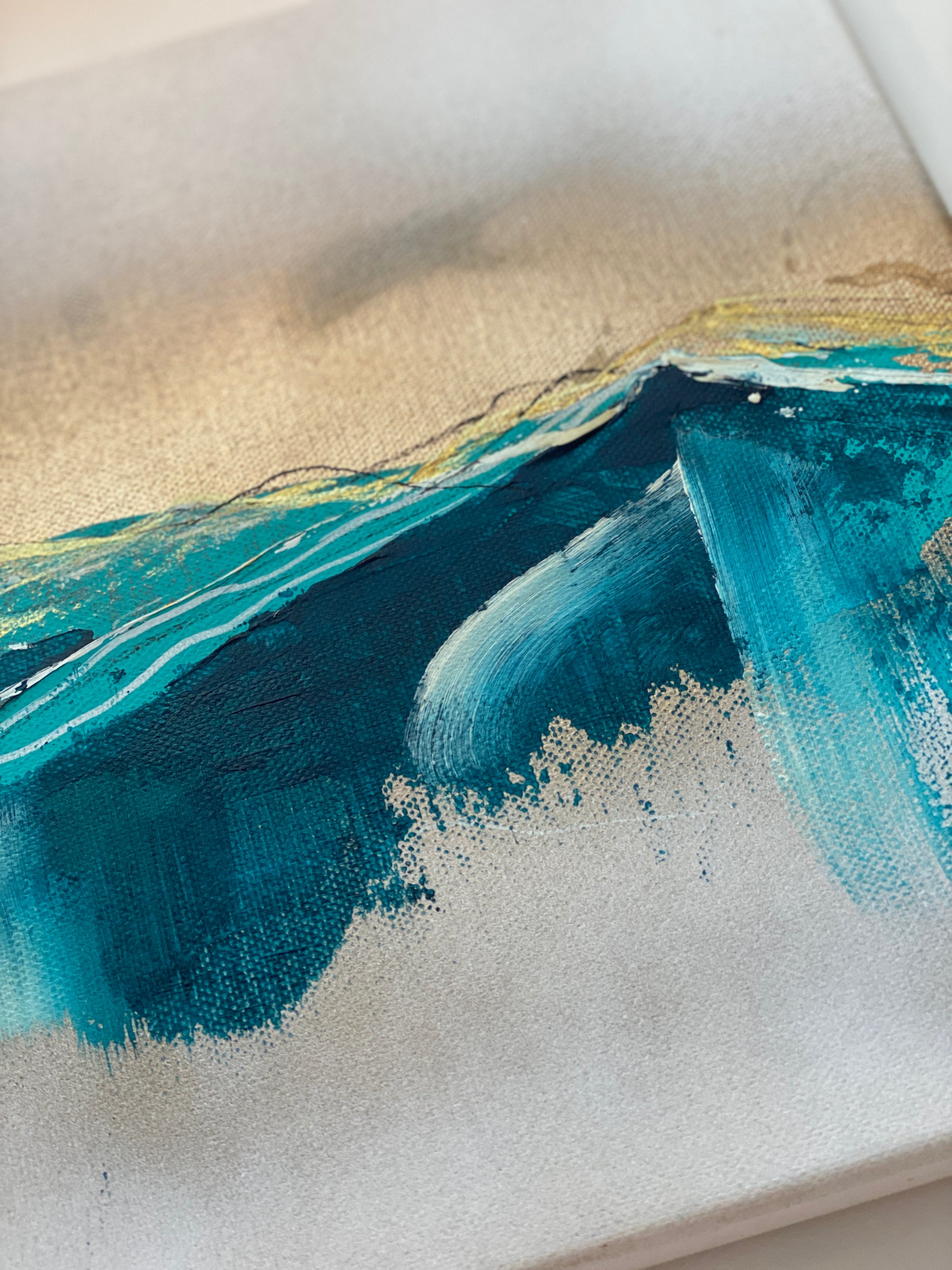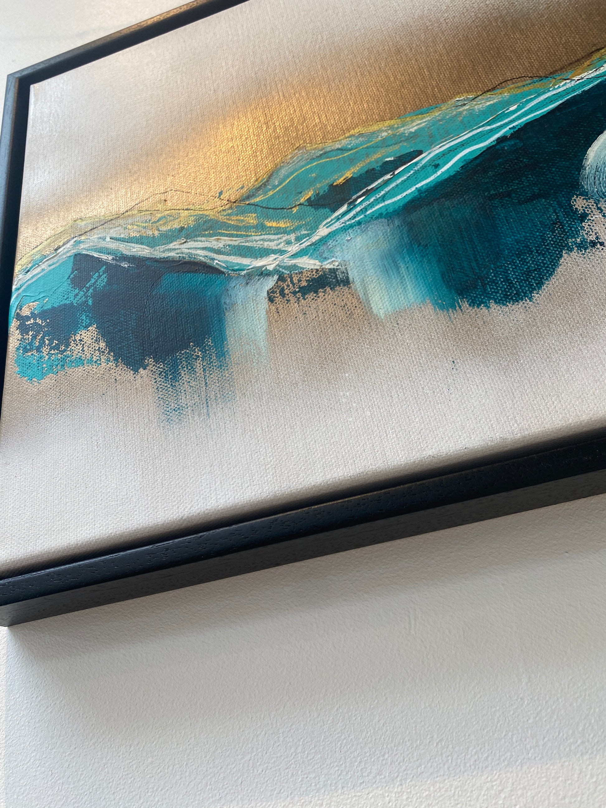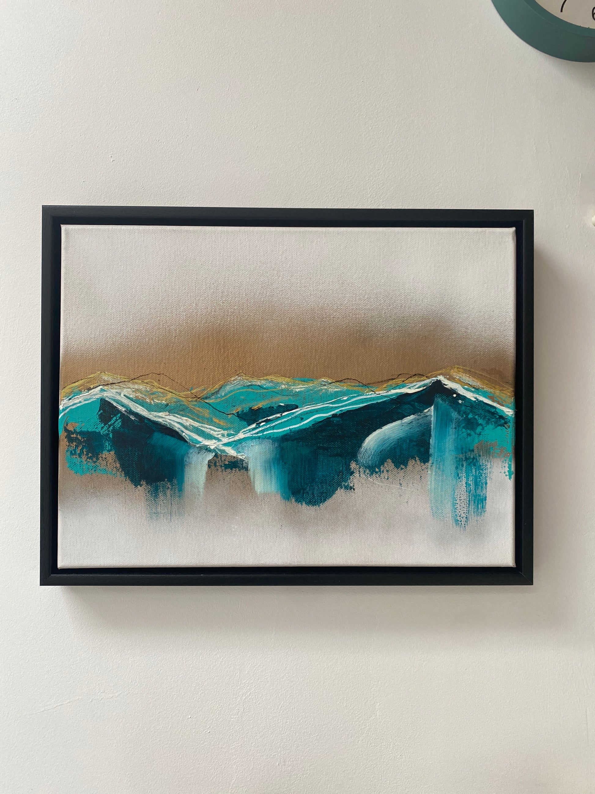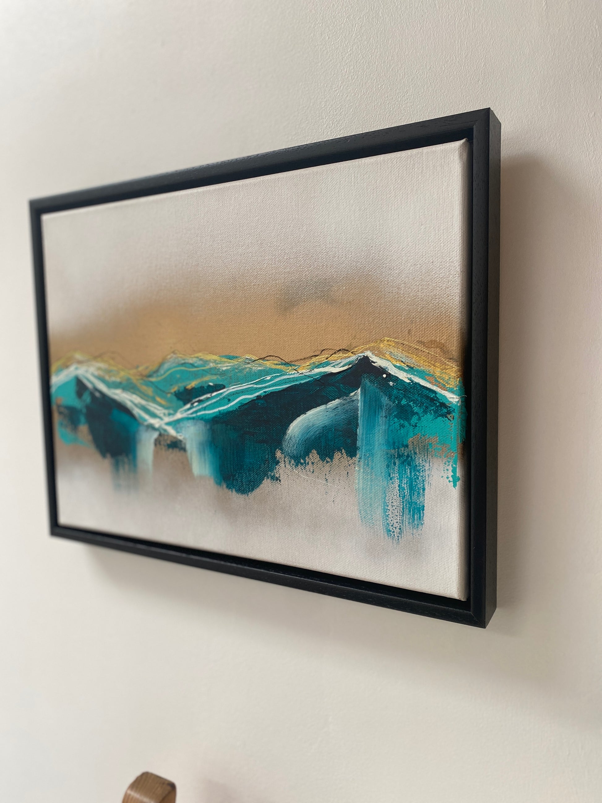 Capturing that feeling of glow at the end of a day in the mountains. The actual glow as the sun goes down, and the personal glow that simply comes from time spent amongst mountain scenery. As you move around where this hangs the light catches in many ways - and in low light the gold still glows. Acrylics with spray paint & pastel on canvas, framed in a black wooden float frame with shadow gap.