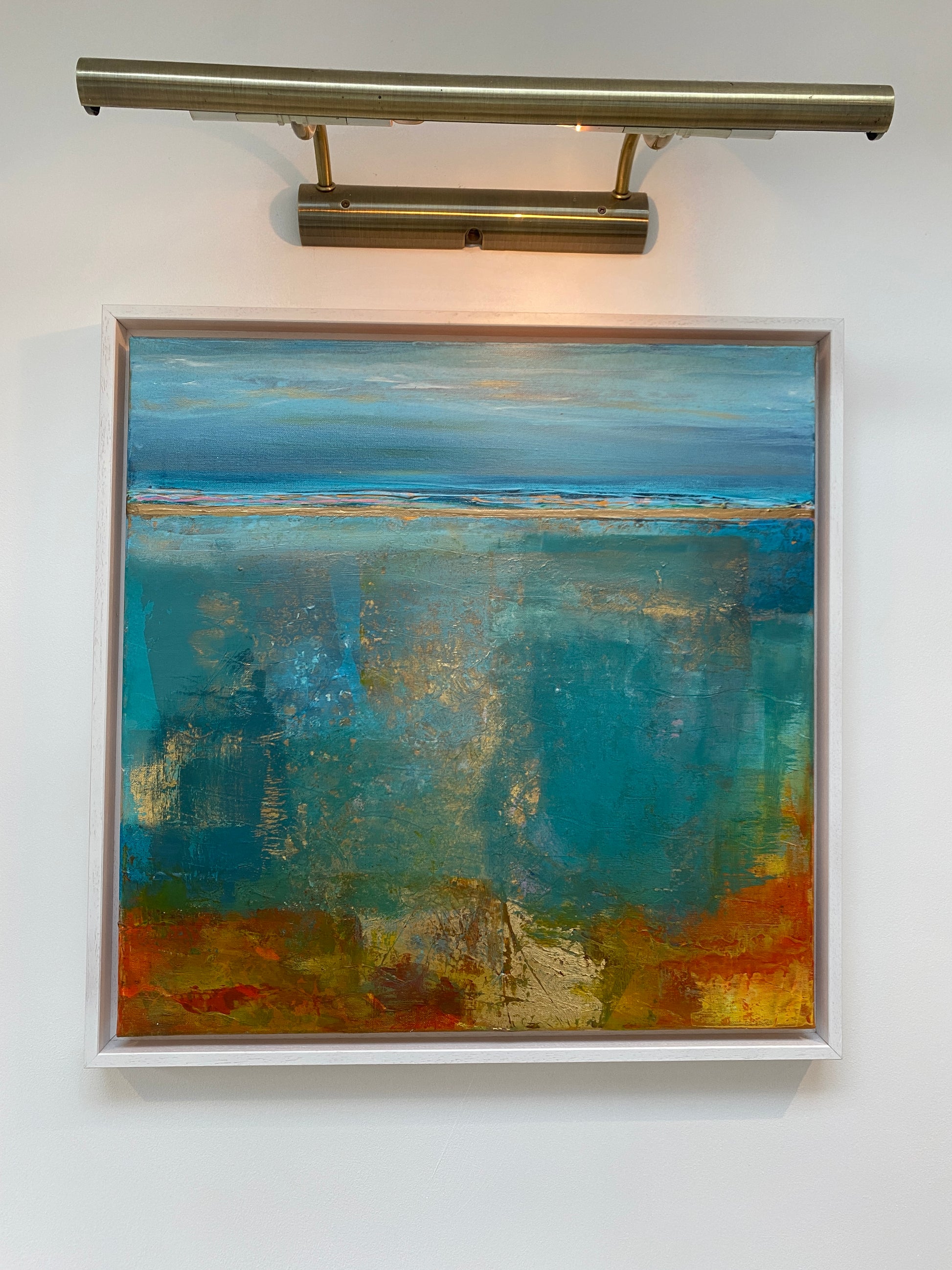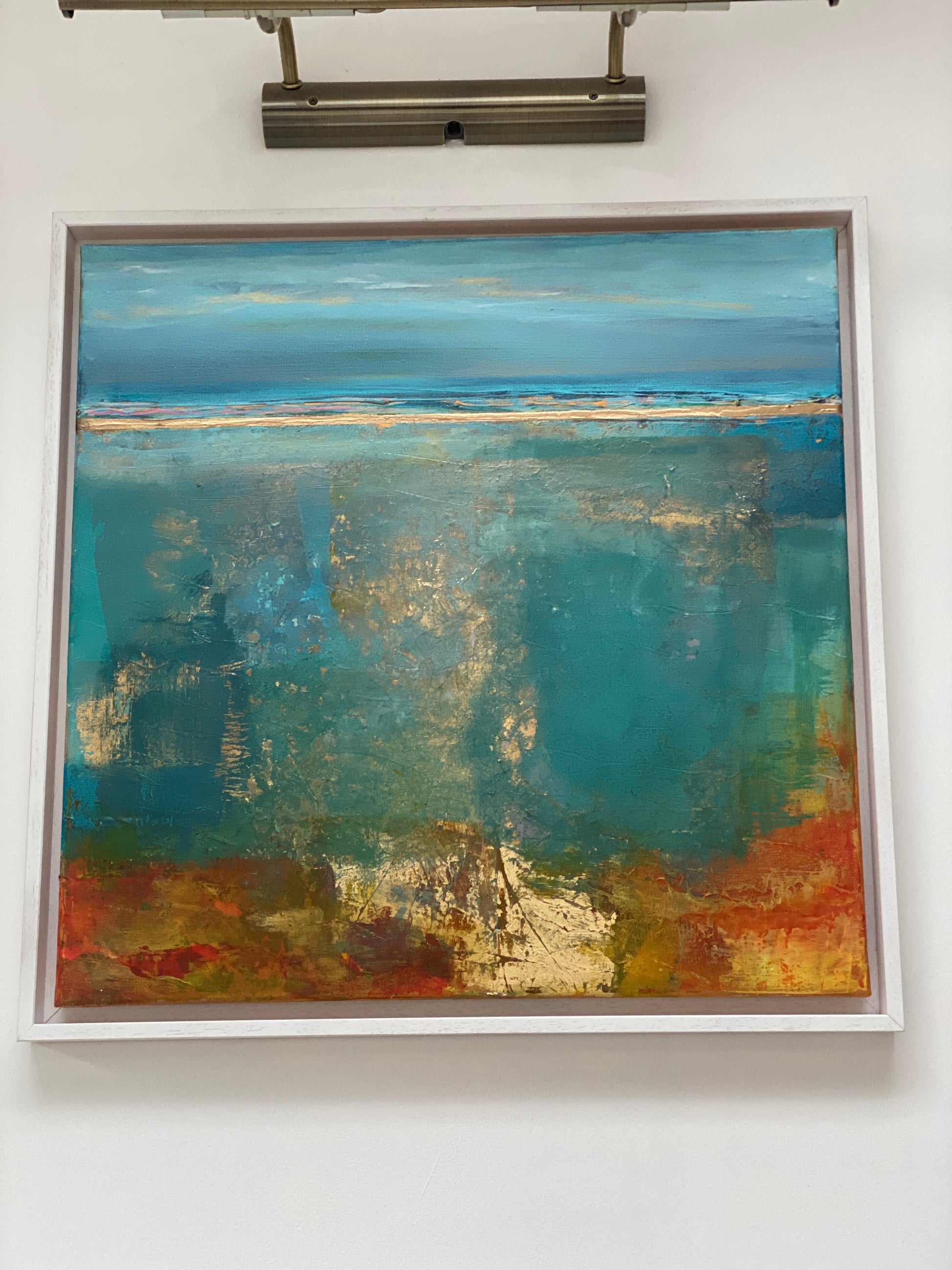 Feelings of the reflections and colours - as you stand on the sand on a summer day - the sea waiting for you in the distance. Acrylic, gold leaf and pastel on canvas 50cm x 50cm - framed ready for you.