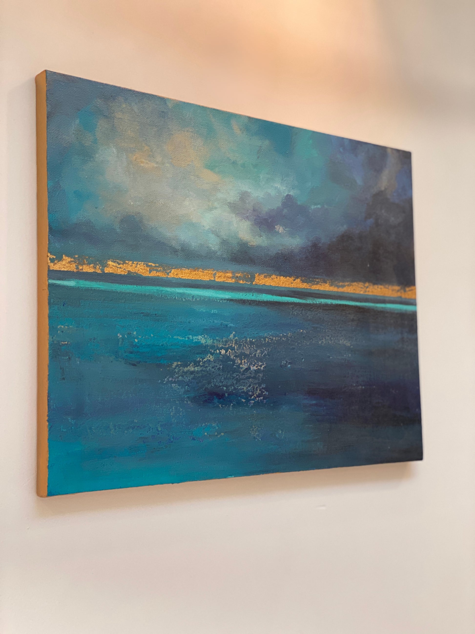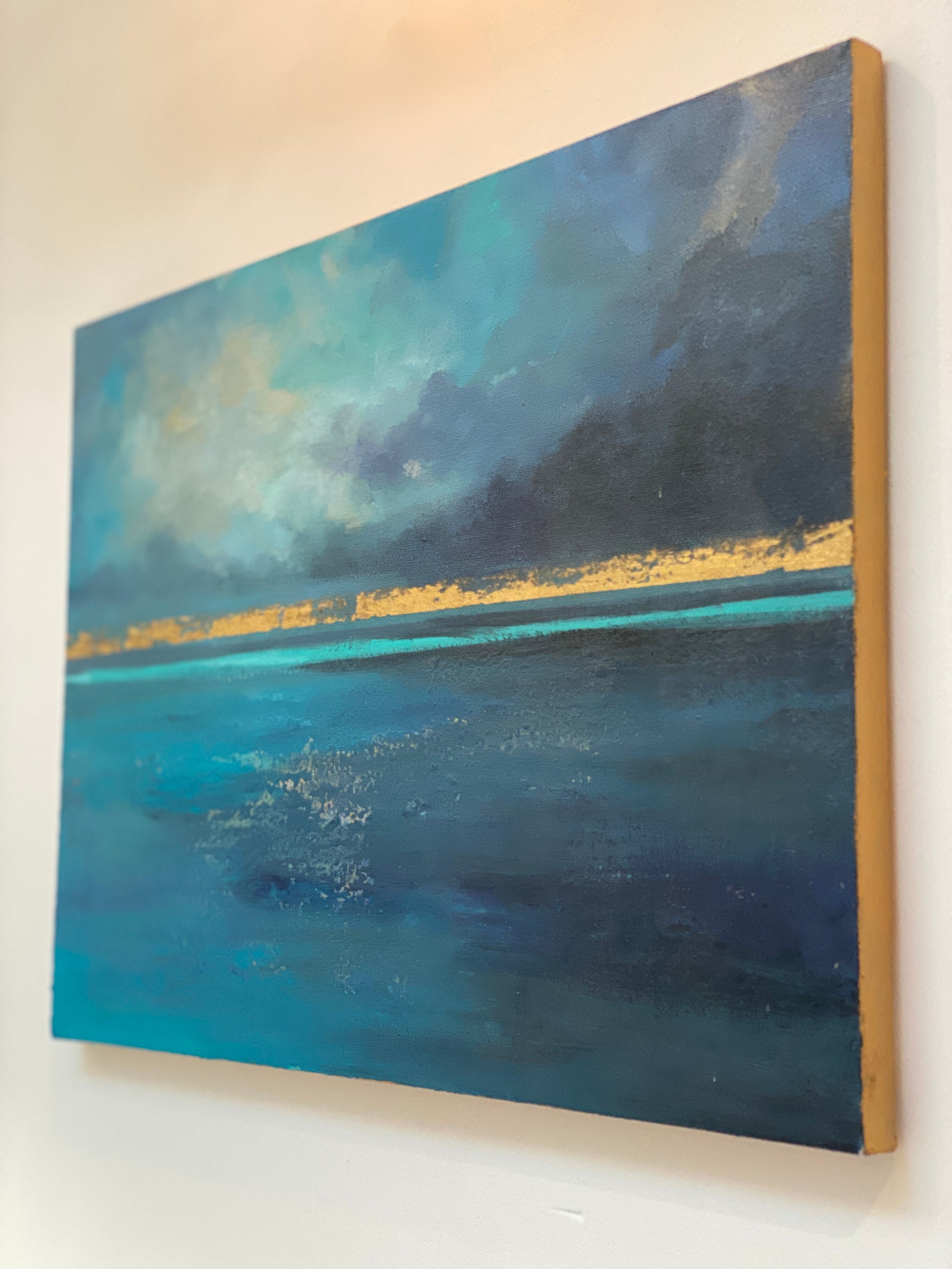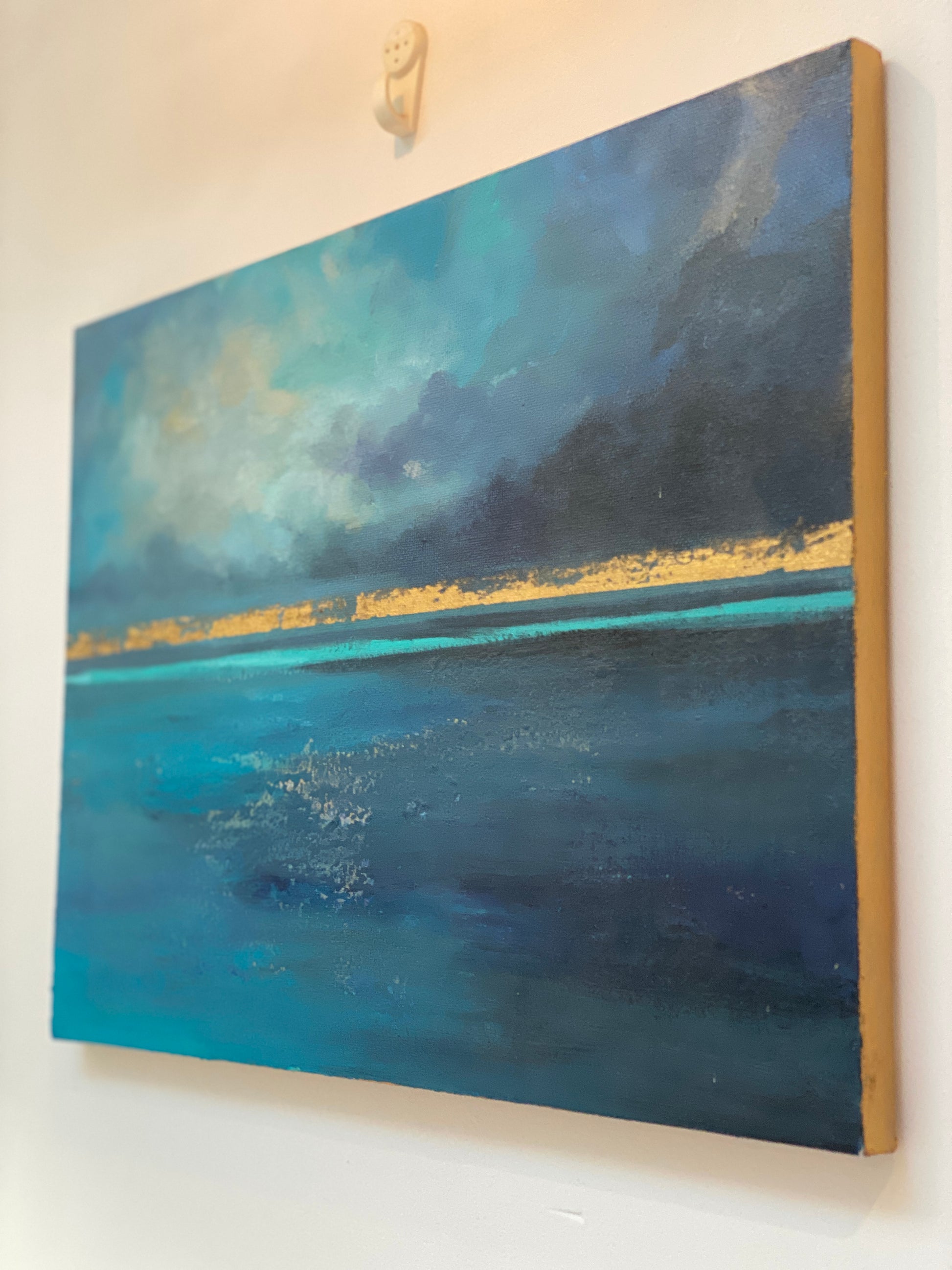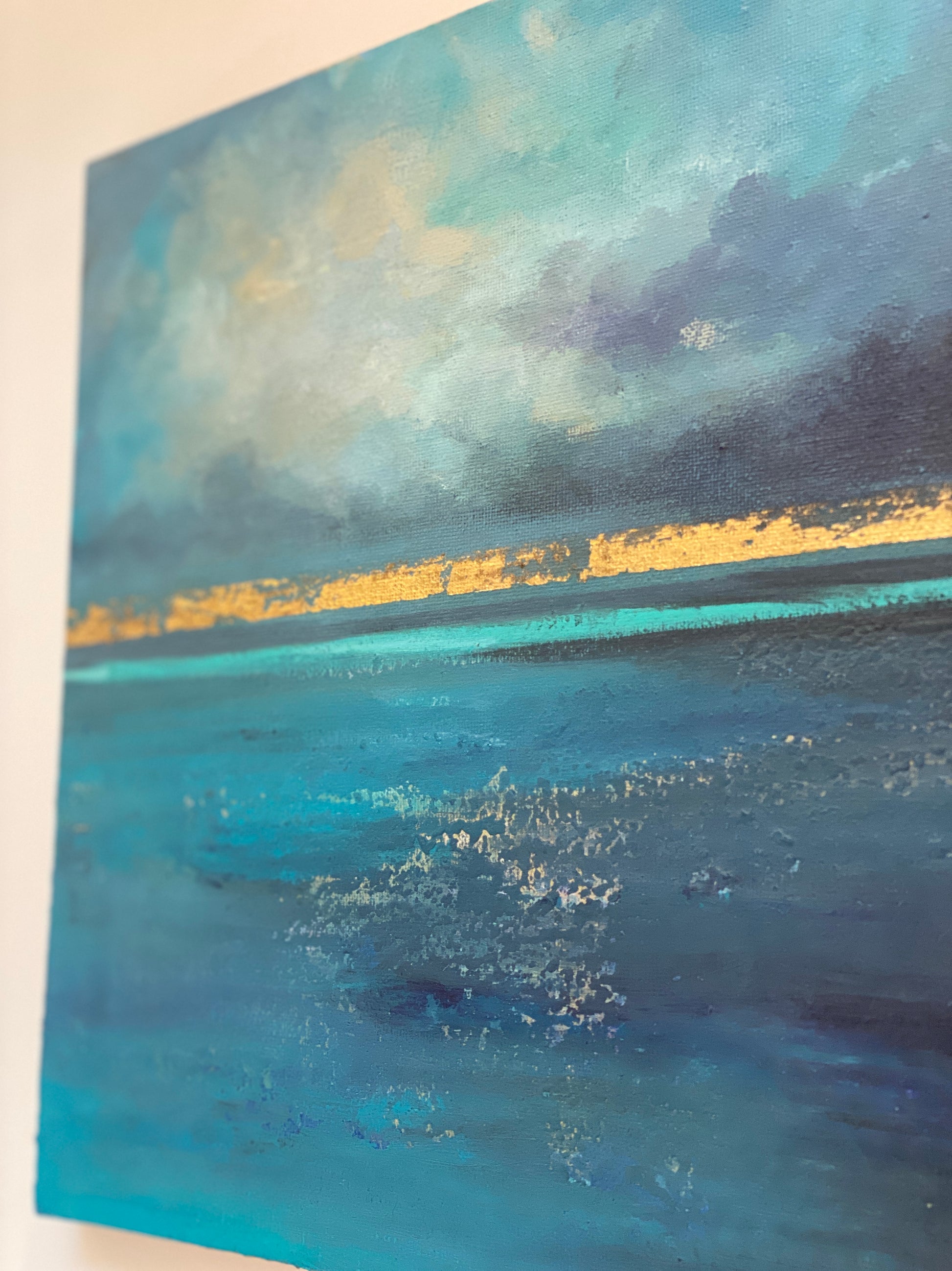 All the blues, and golden light. Acrylic and gold leaf on canvas. That unexpected light between the clouds and sea.
