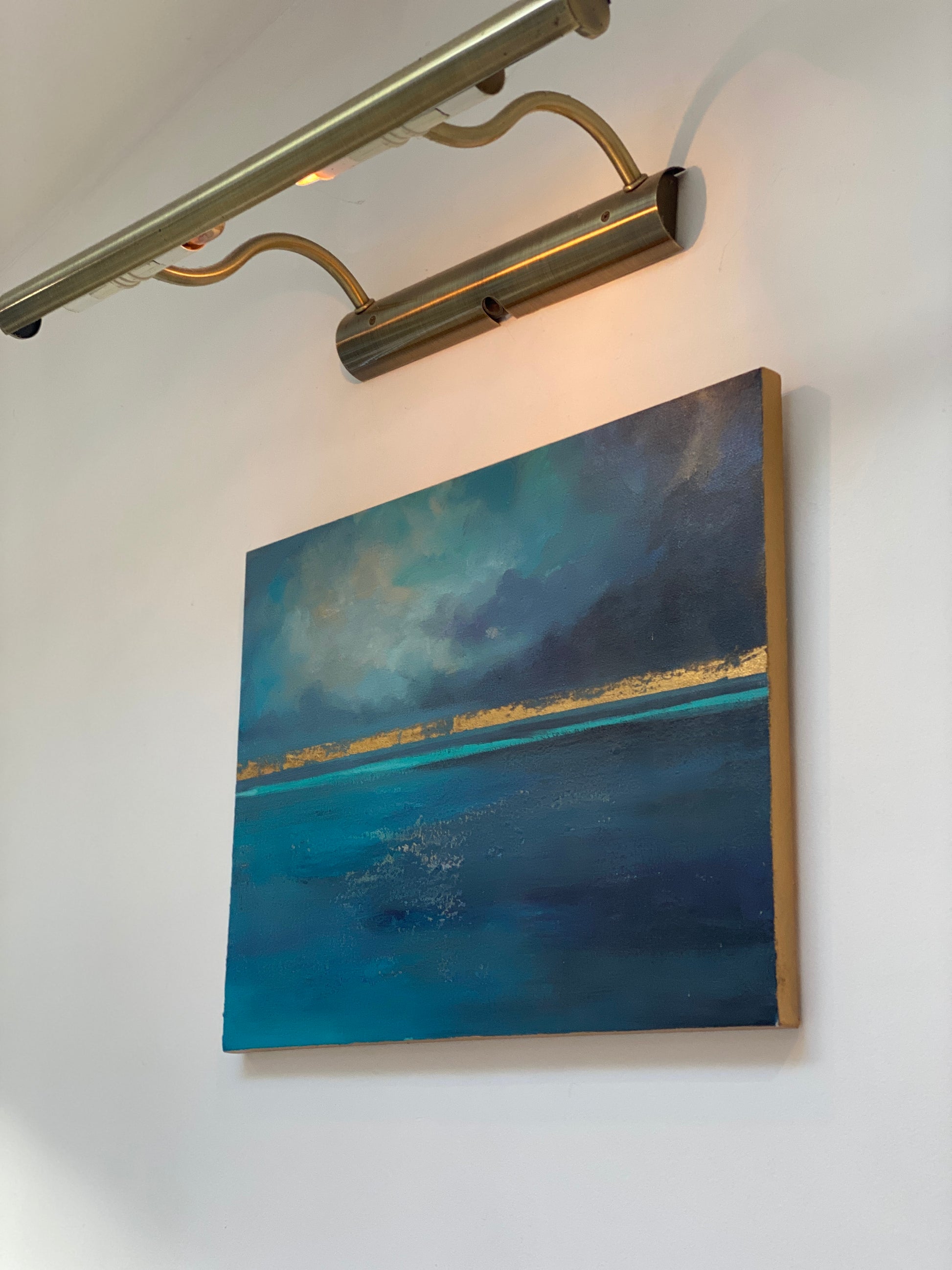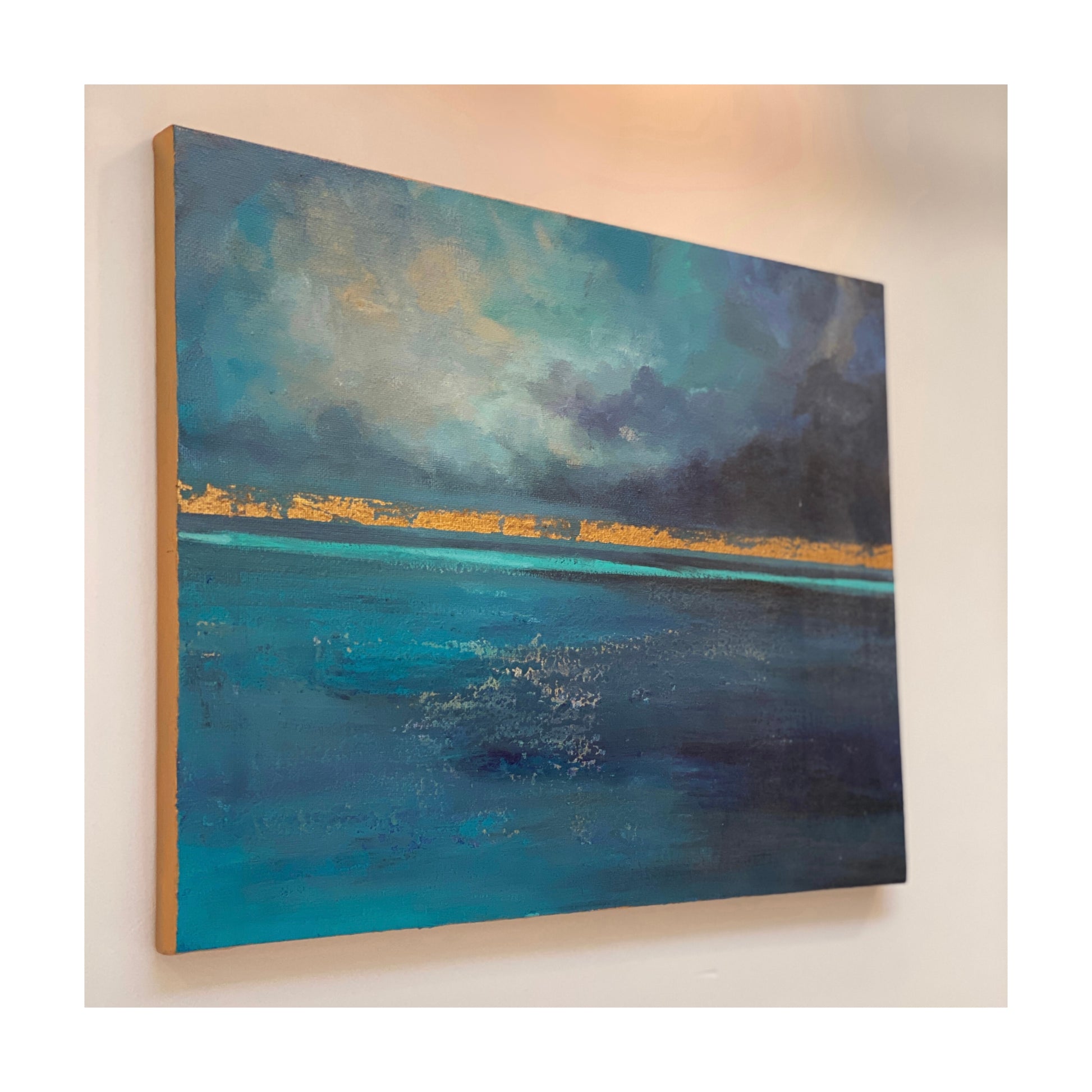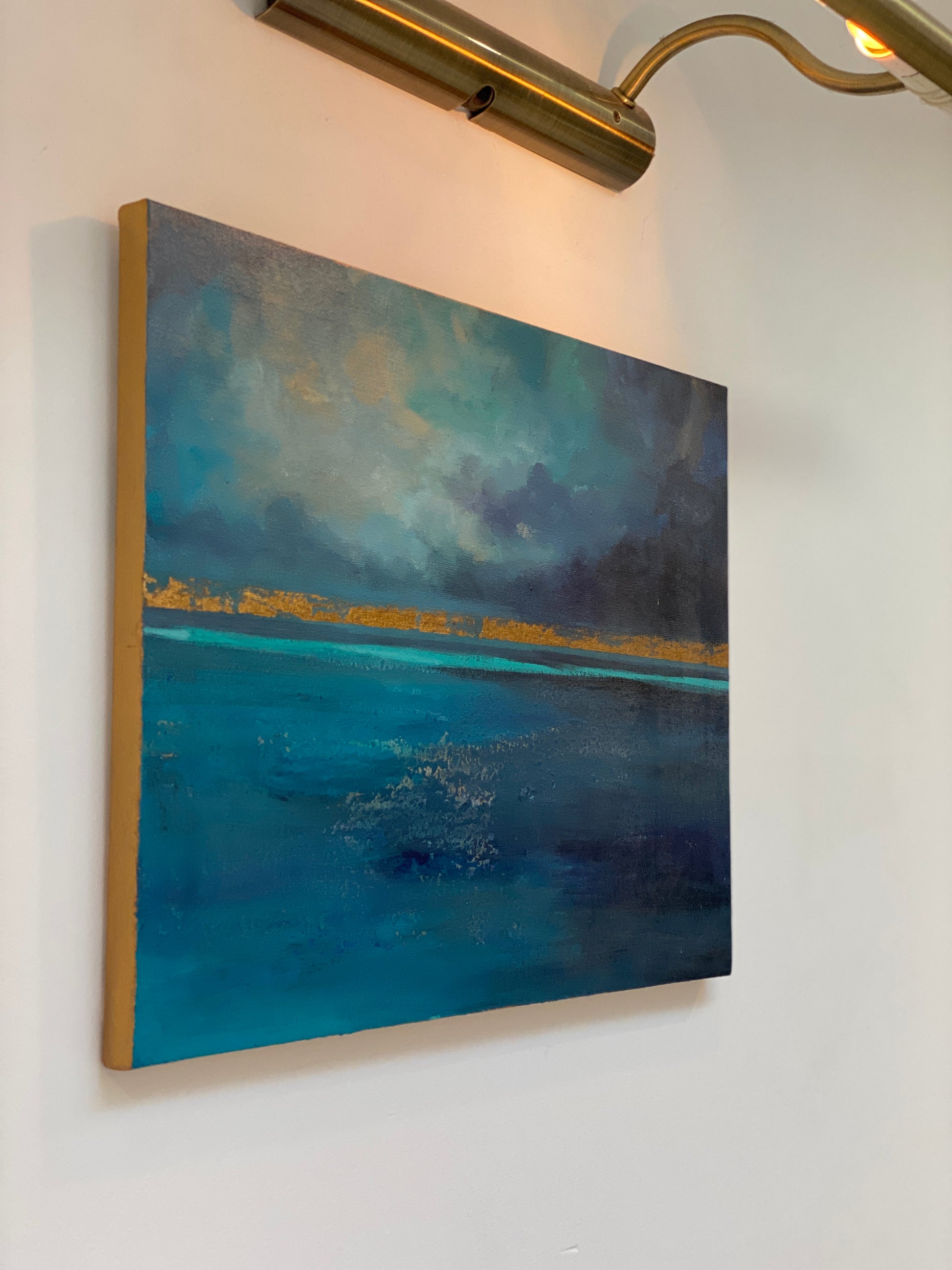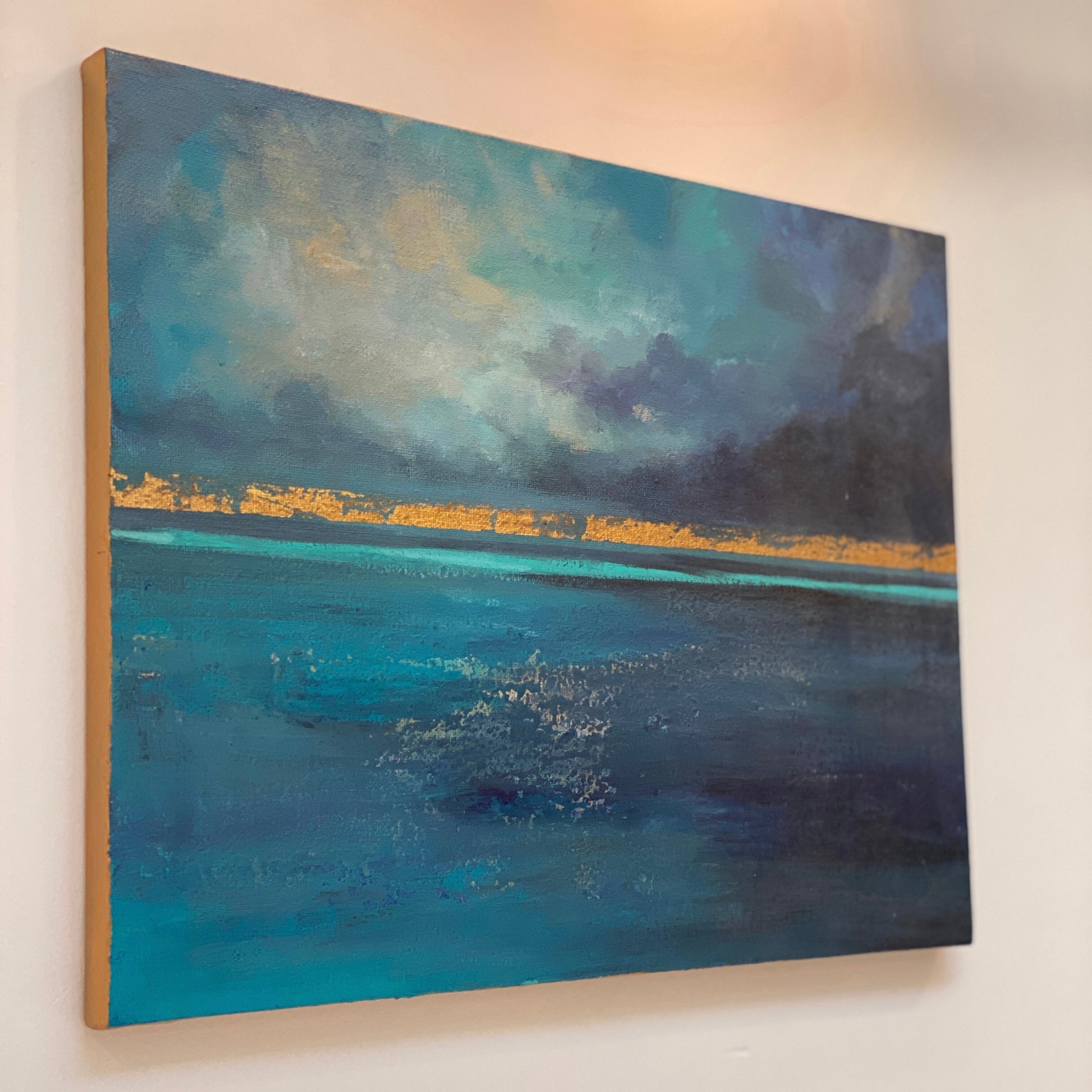 All the blues, and golden light. Acrylic and gold leaf on canvas. That unexpected light between the clouds and sea.