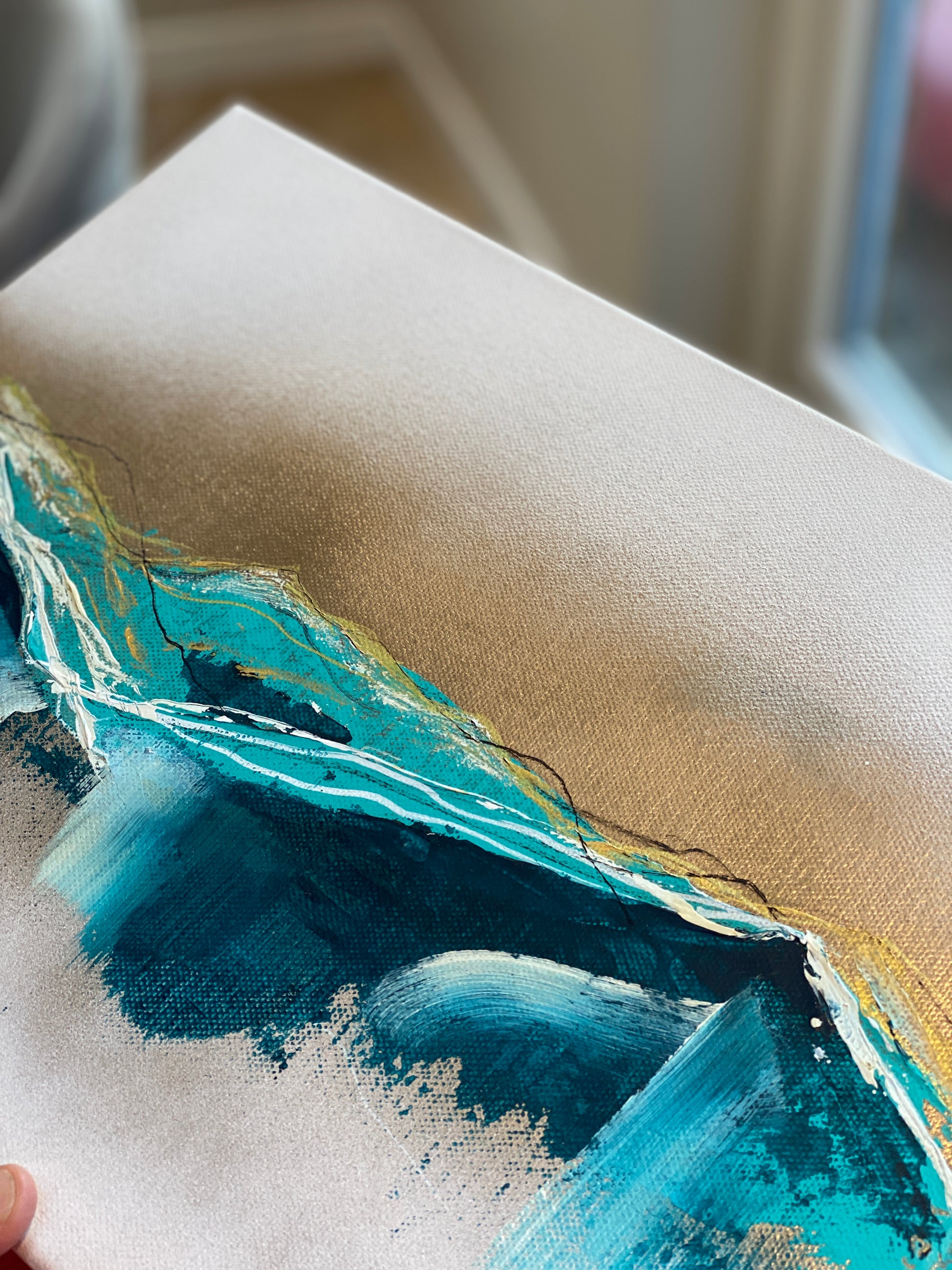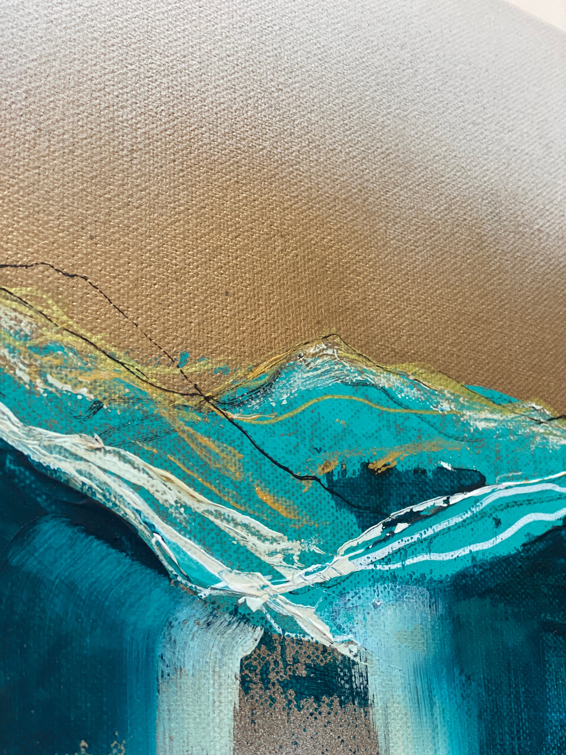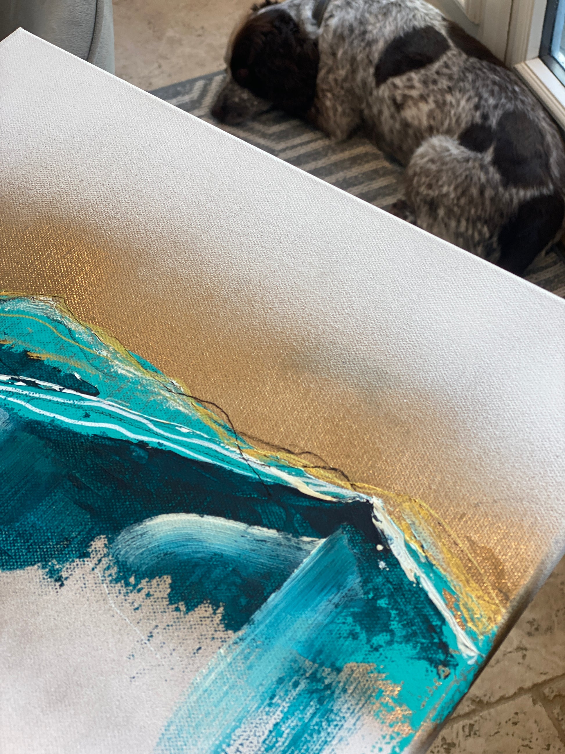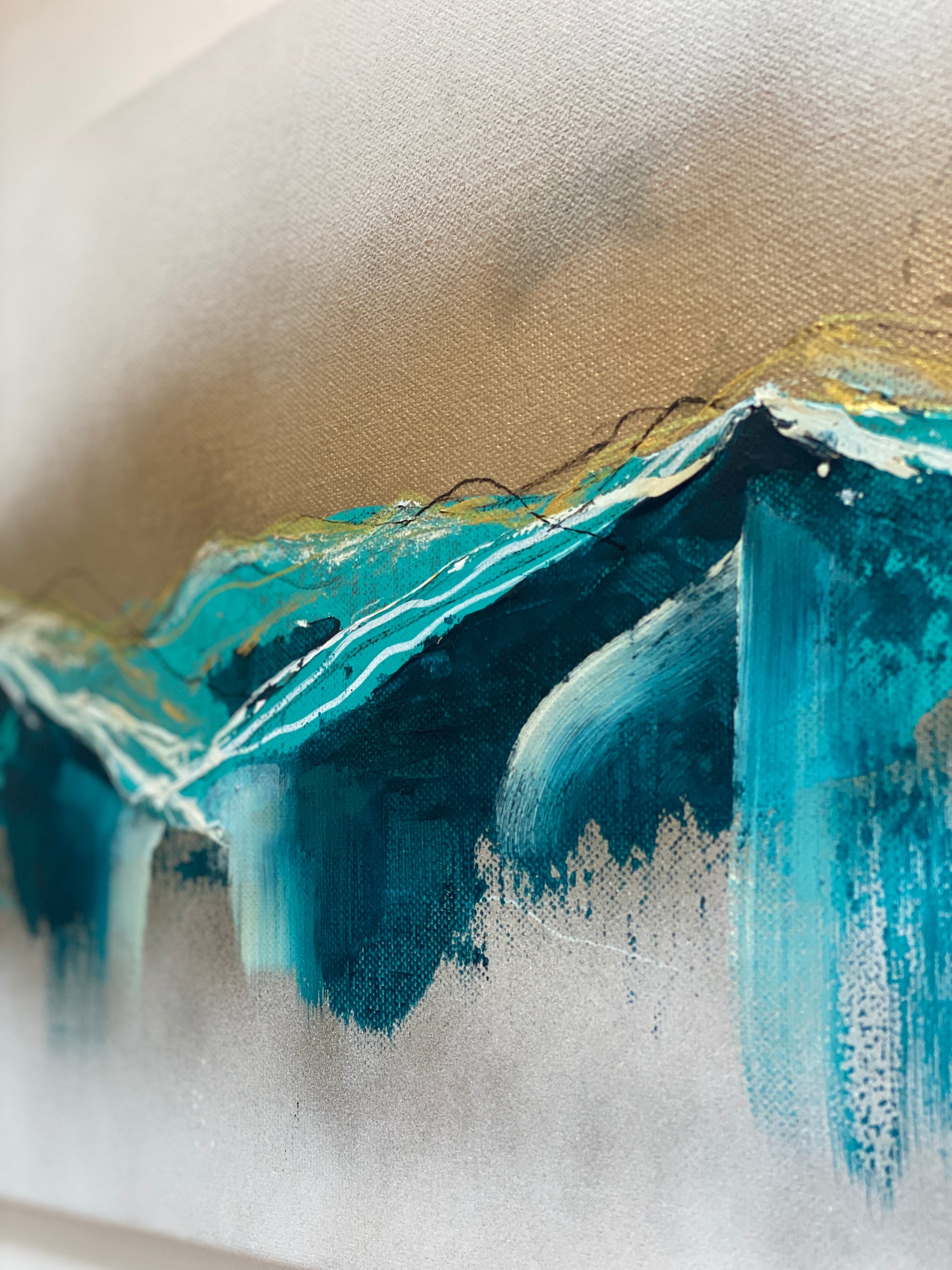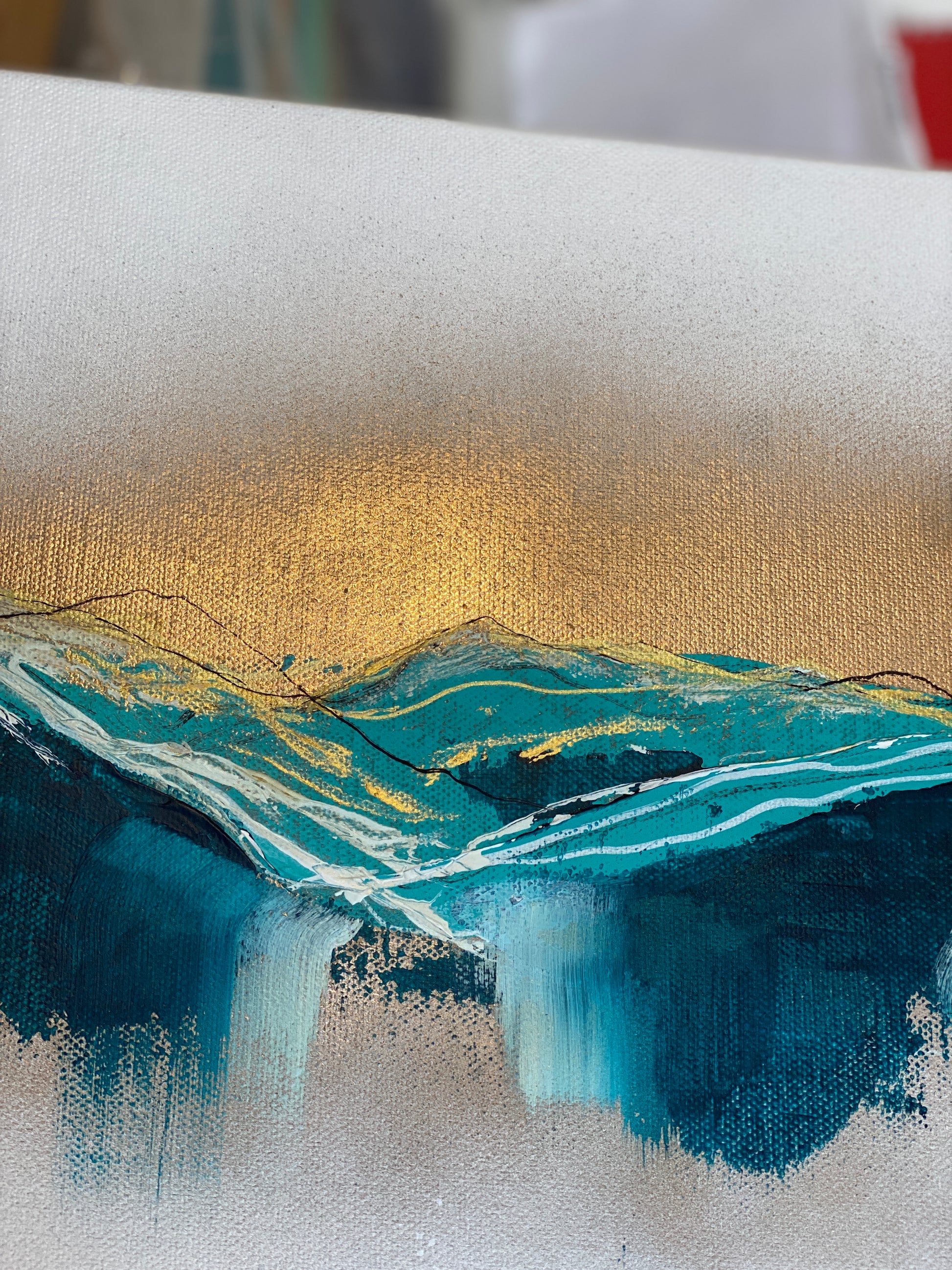 All the blues, and golden light. Acrylic and gold leaf on canvas. That unexpected light between the clouds and sea.