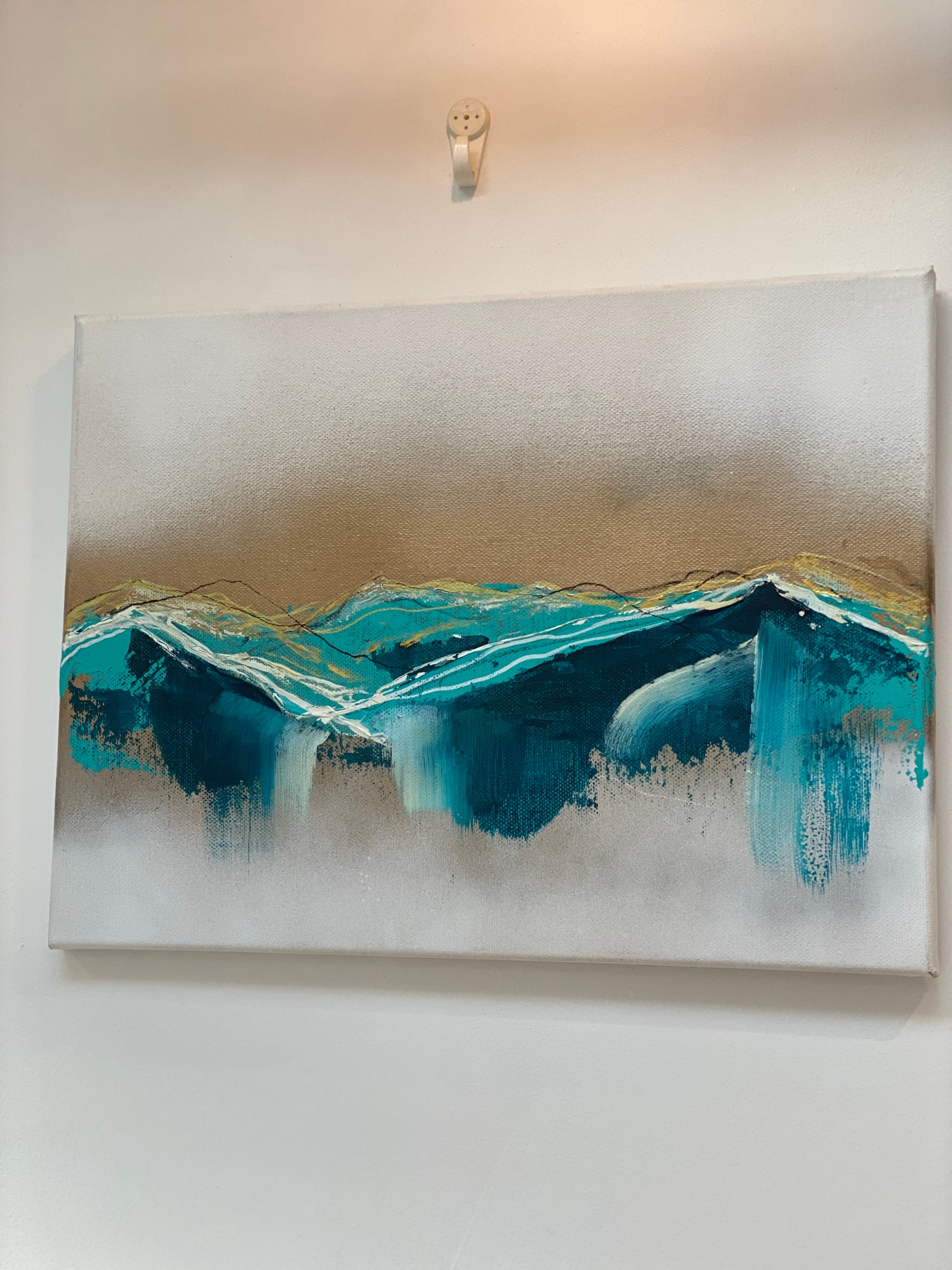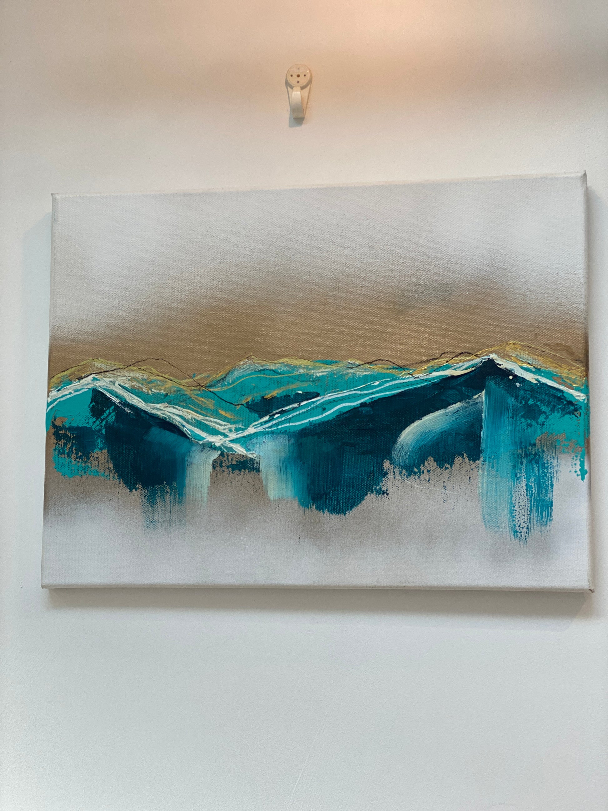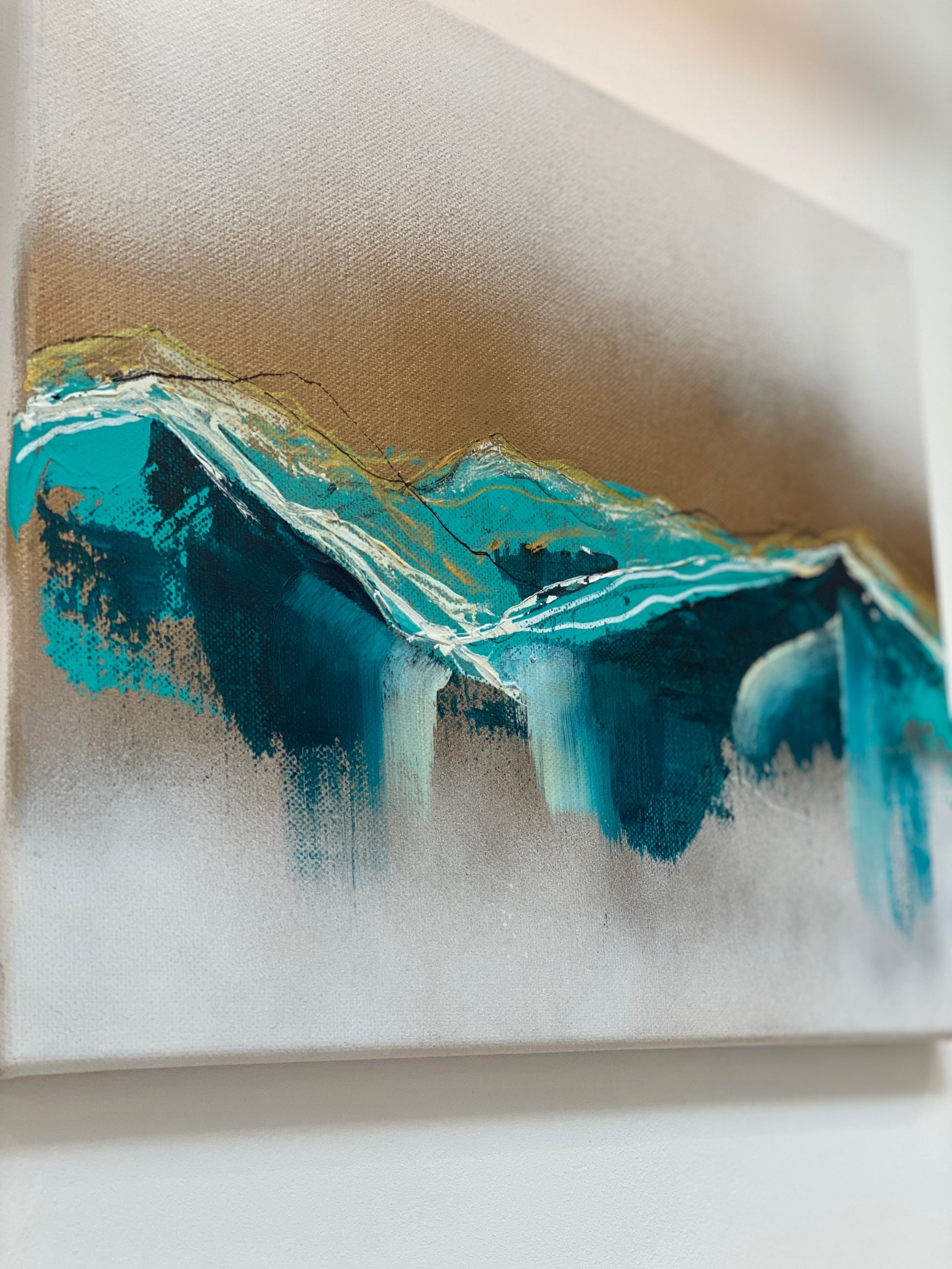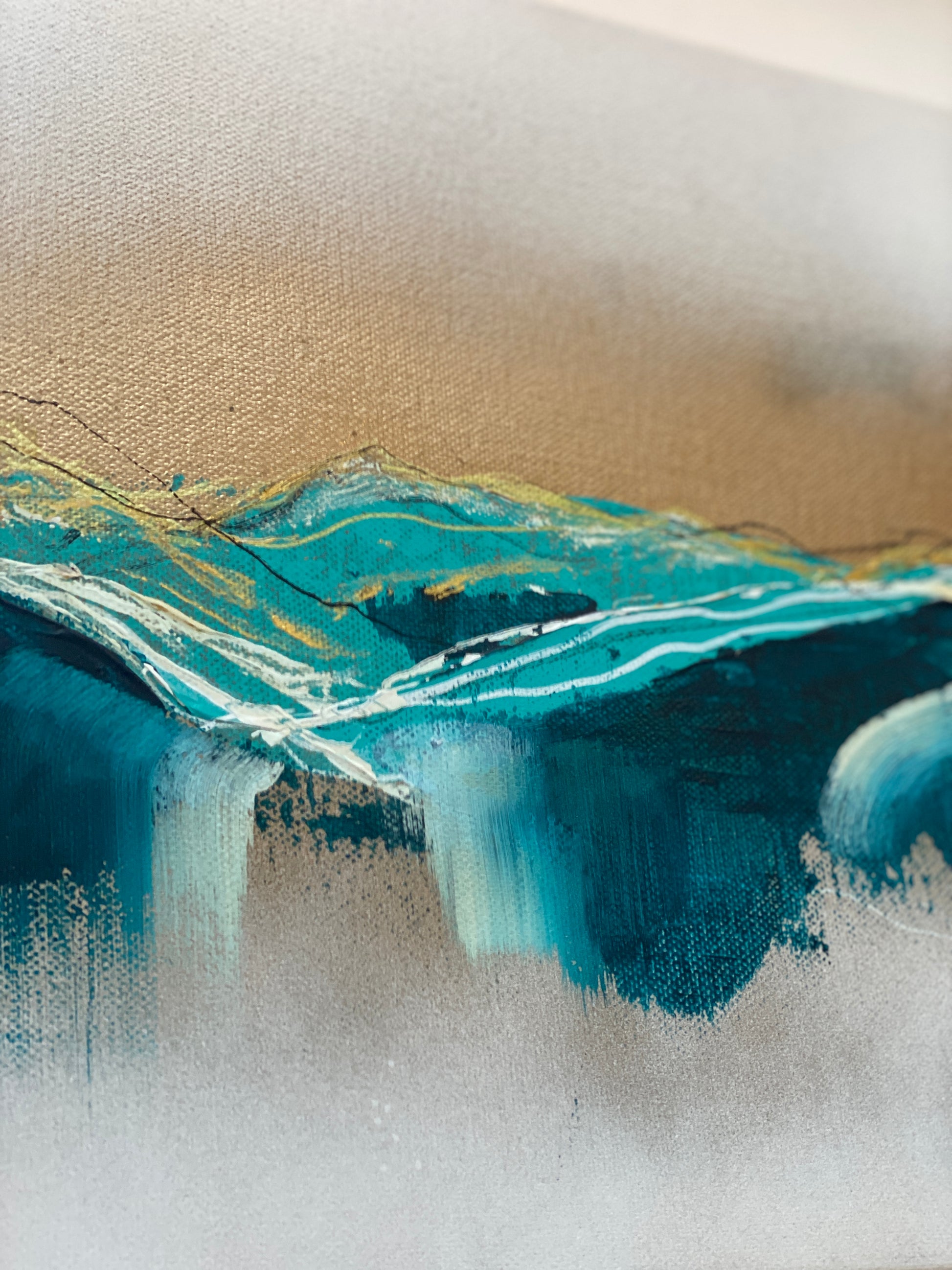 All the blues, and golden light. Acrylic and gold leaf on canvas. That unexpected light between the clouds and sea.