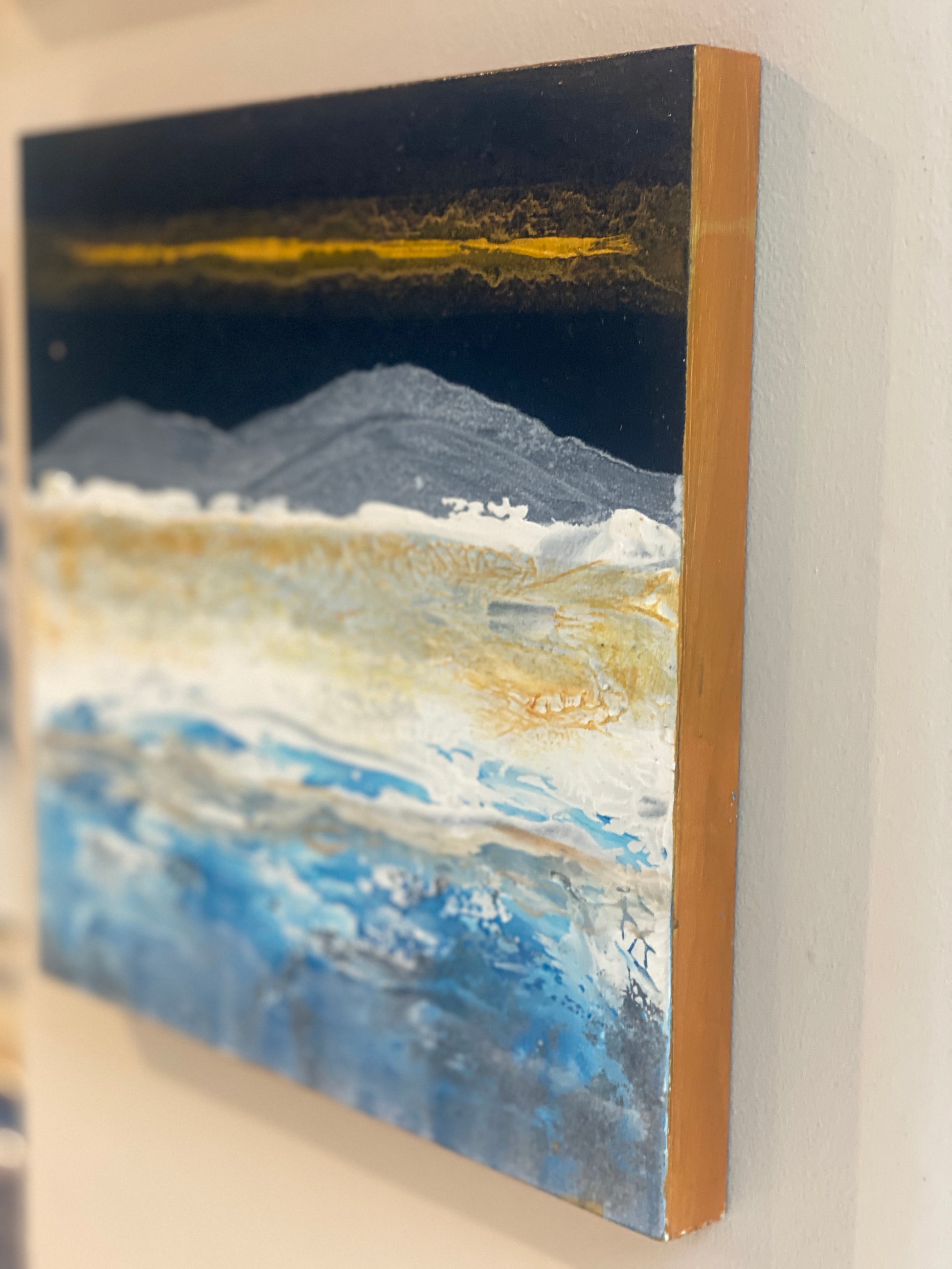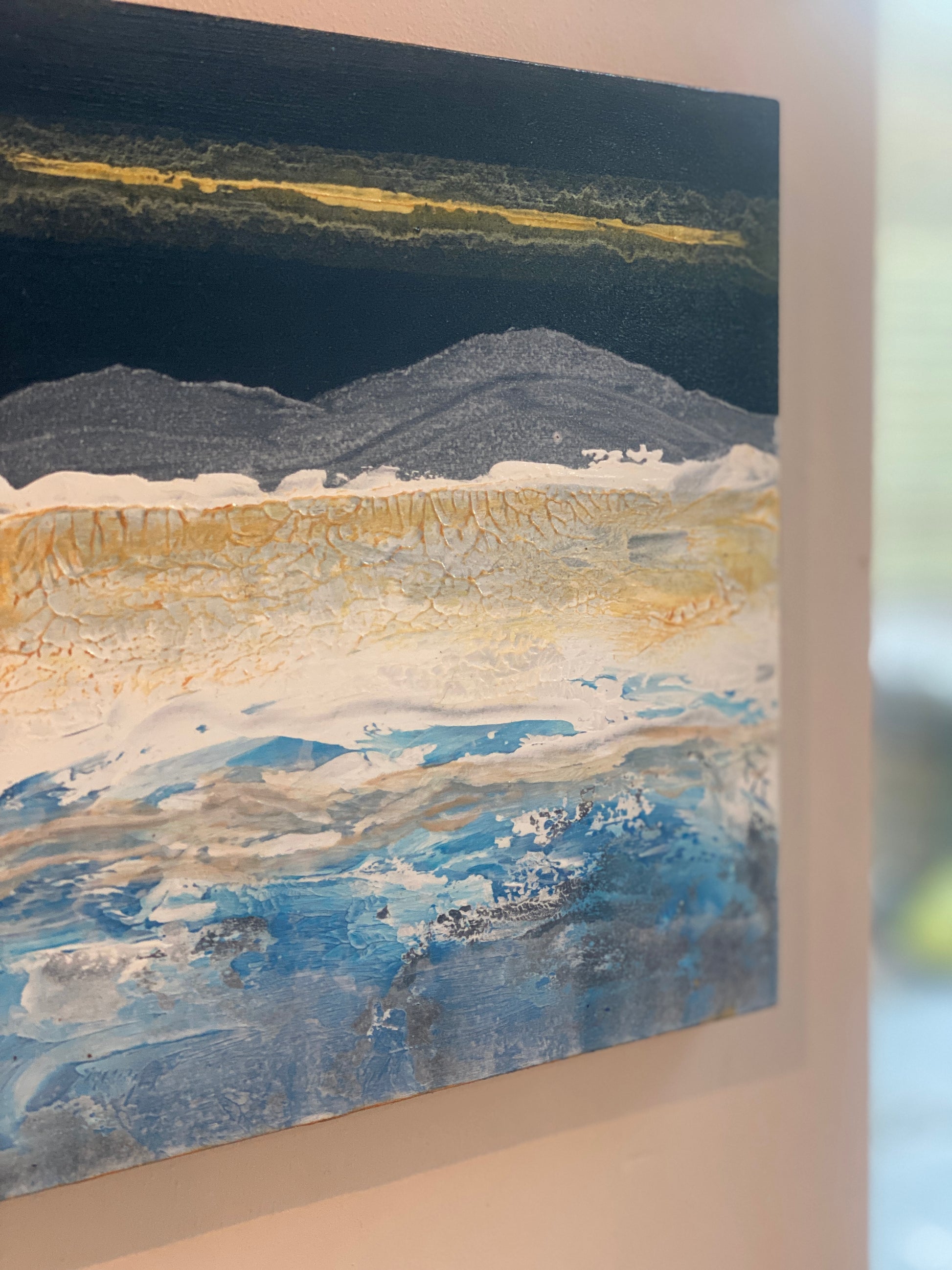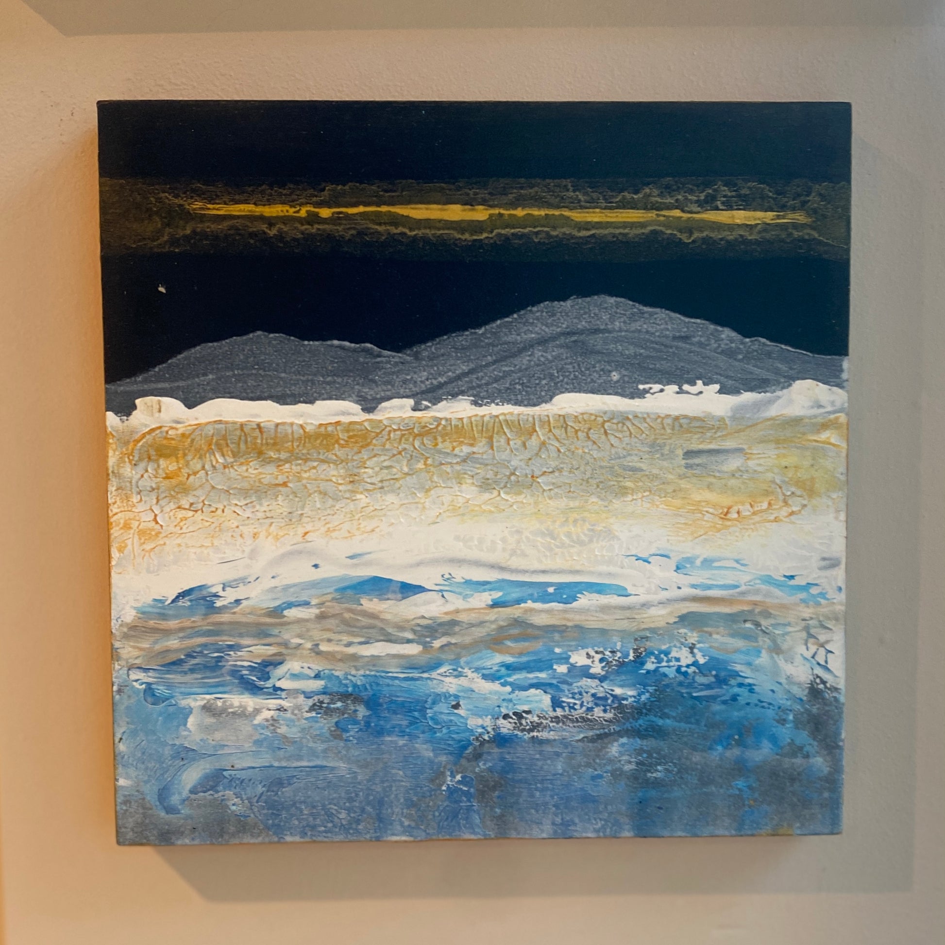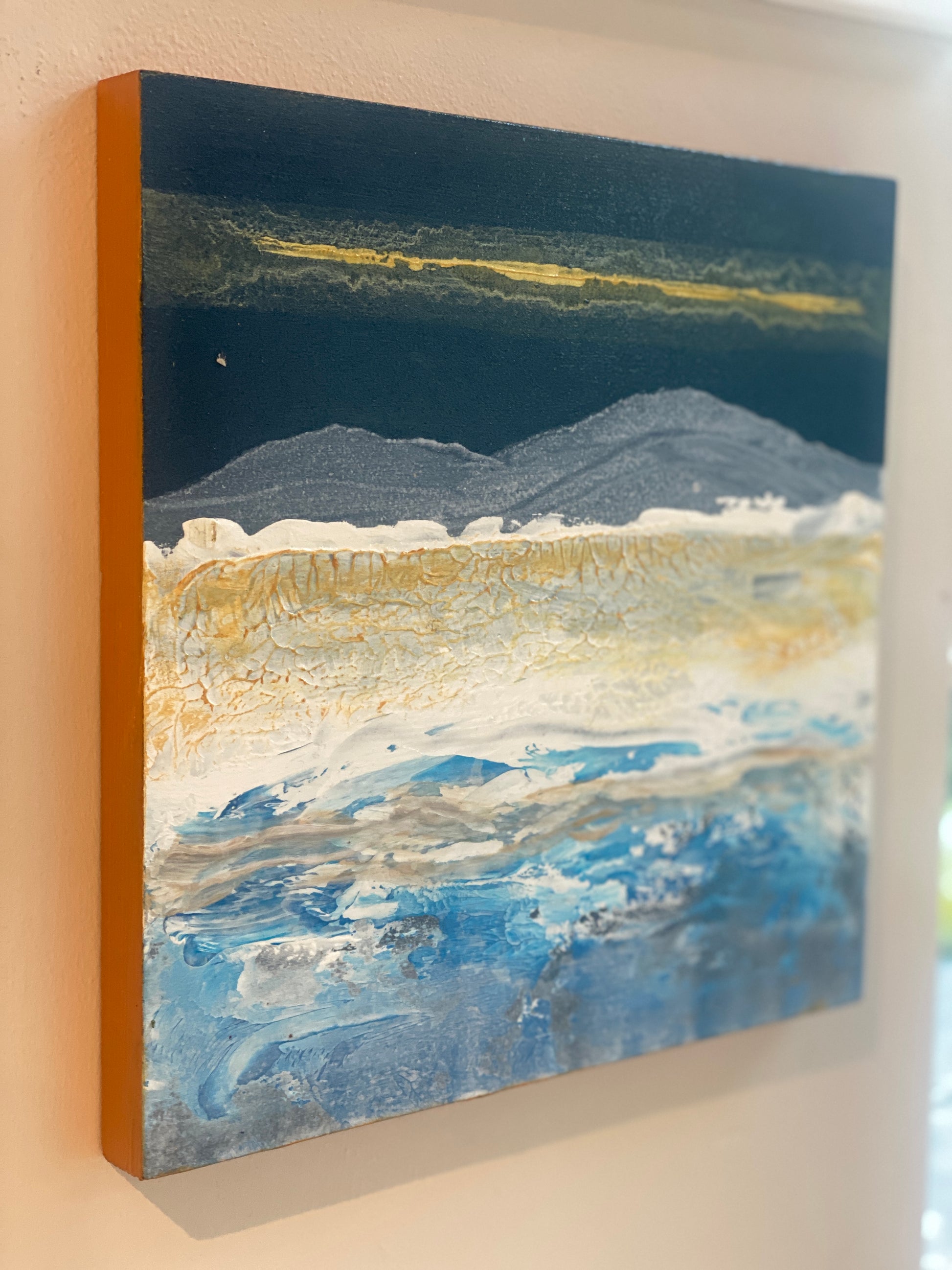 The feeling of crisp days in the mountains & lakes. Textured acrylic on wooden block with gold edges. 20cm x 20cm - 1.5cm deep.