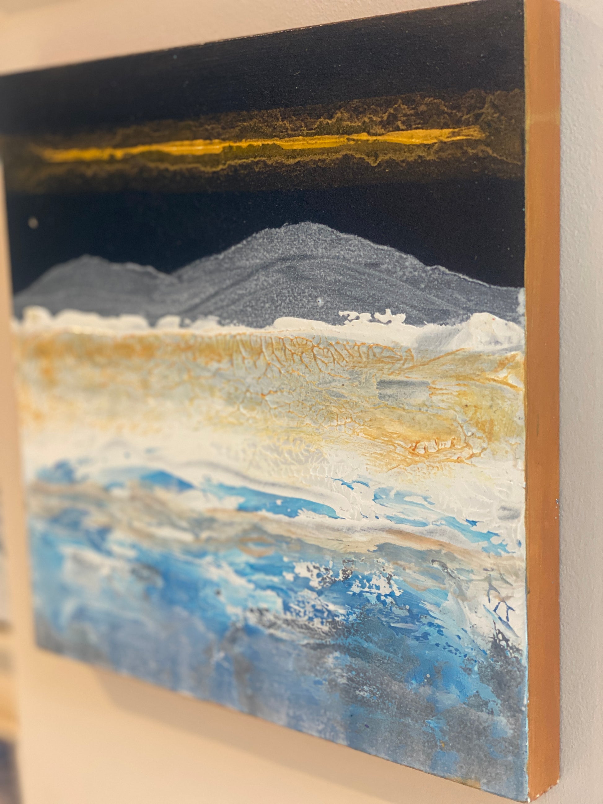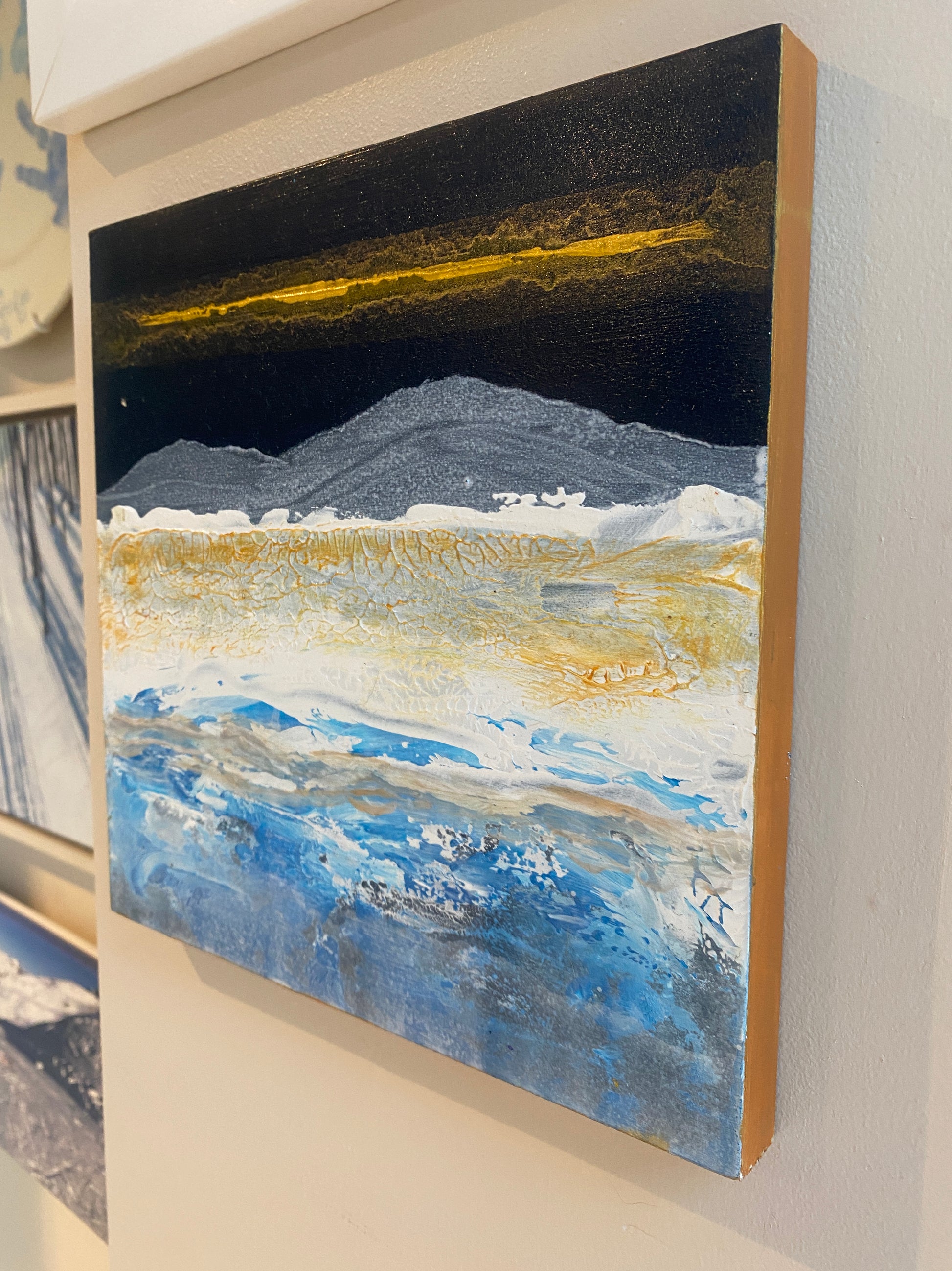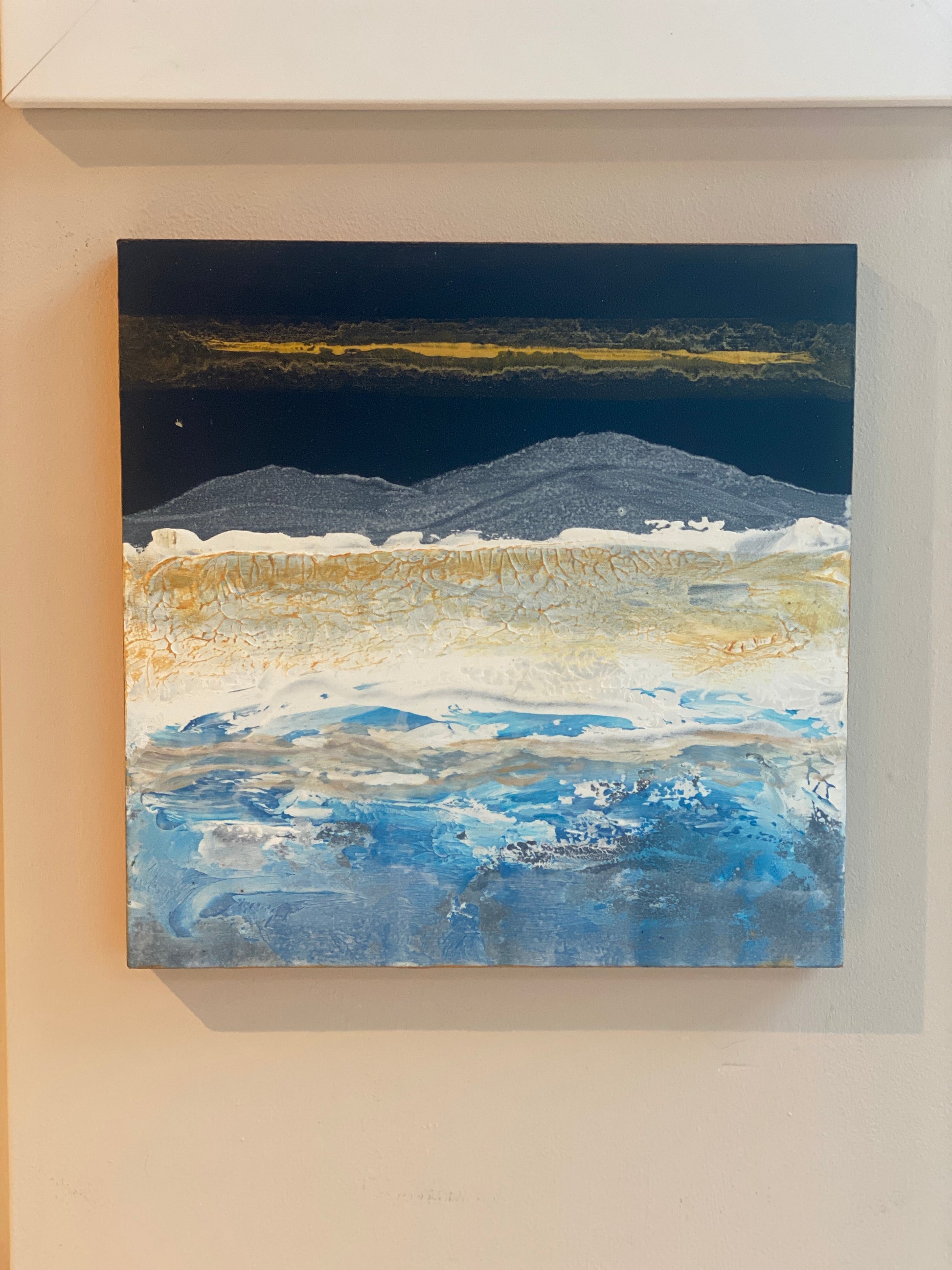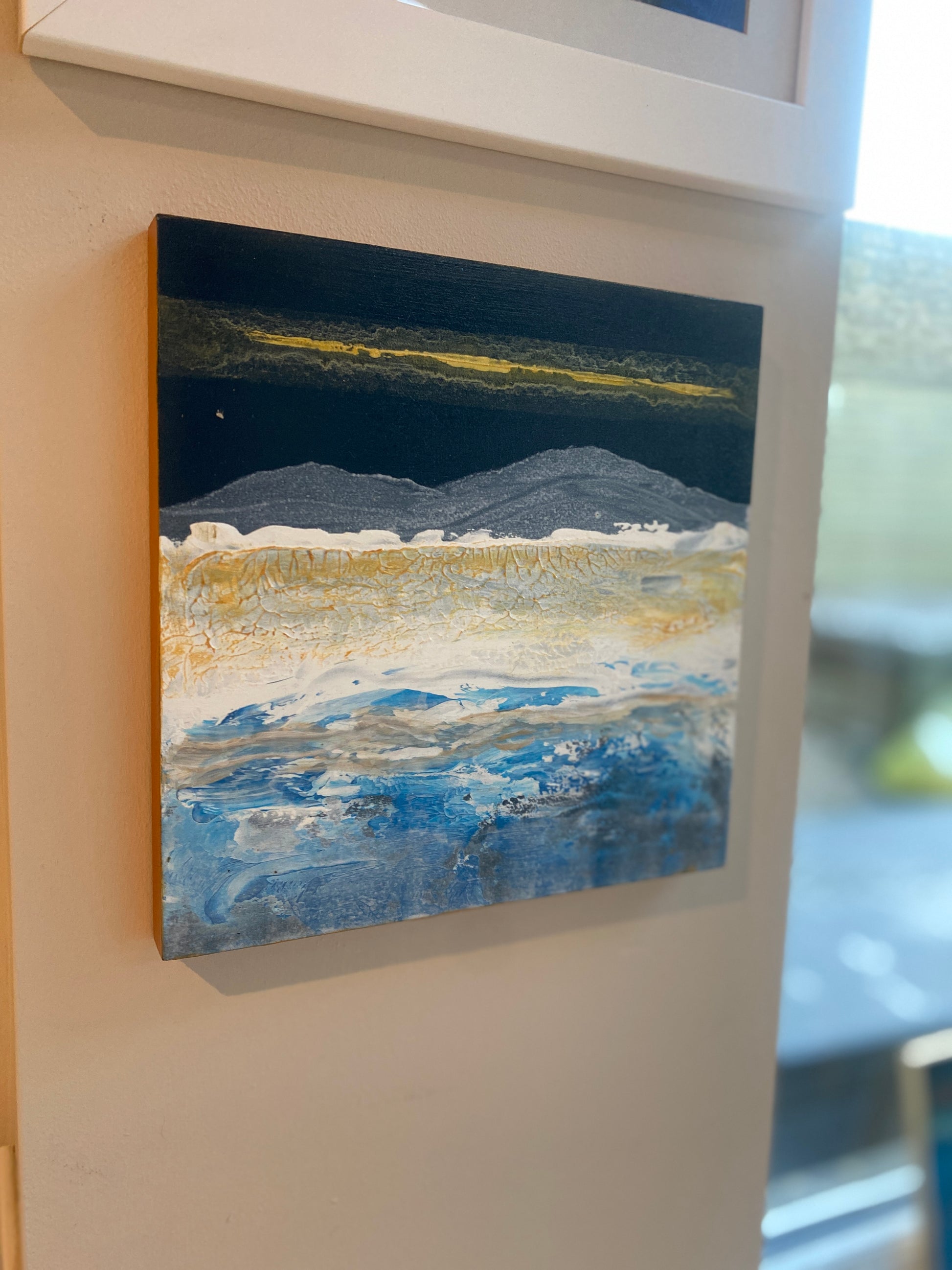 The feeling of crisp days in the mountains & lakes. Textured acrylic on wooden block with gold edges. 20cm x 20cm - 1.5cm deep.