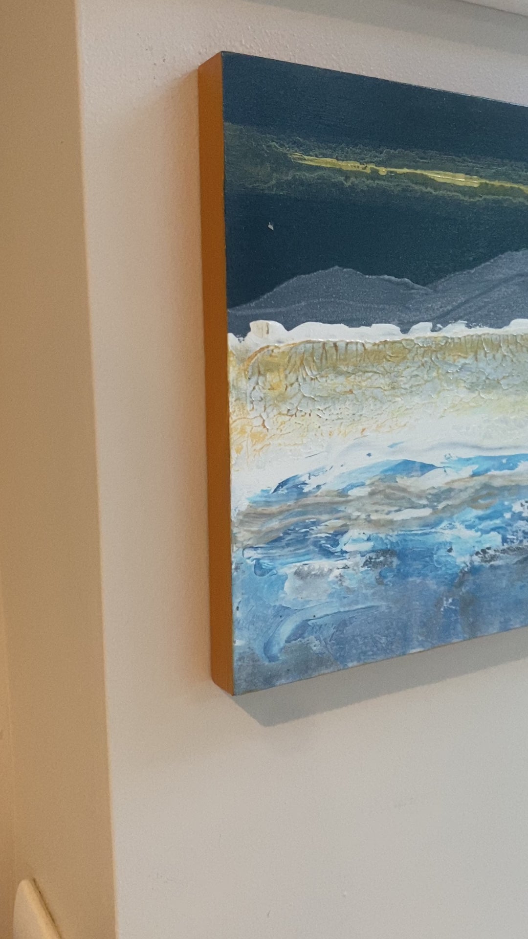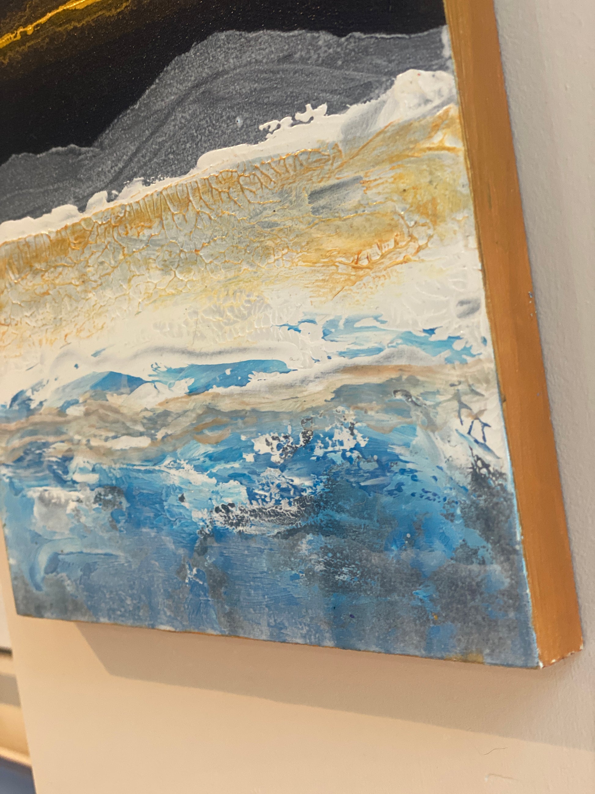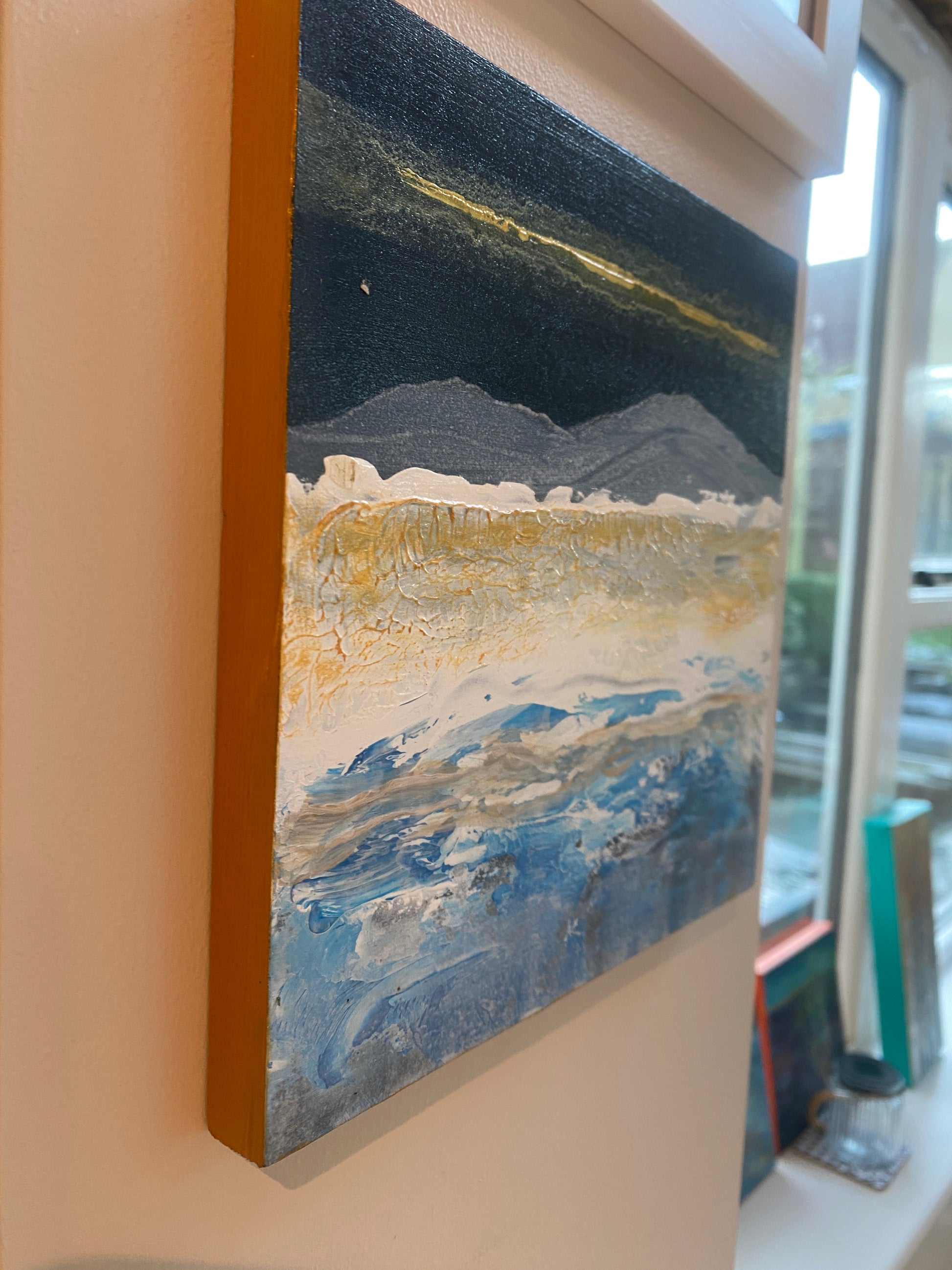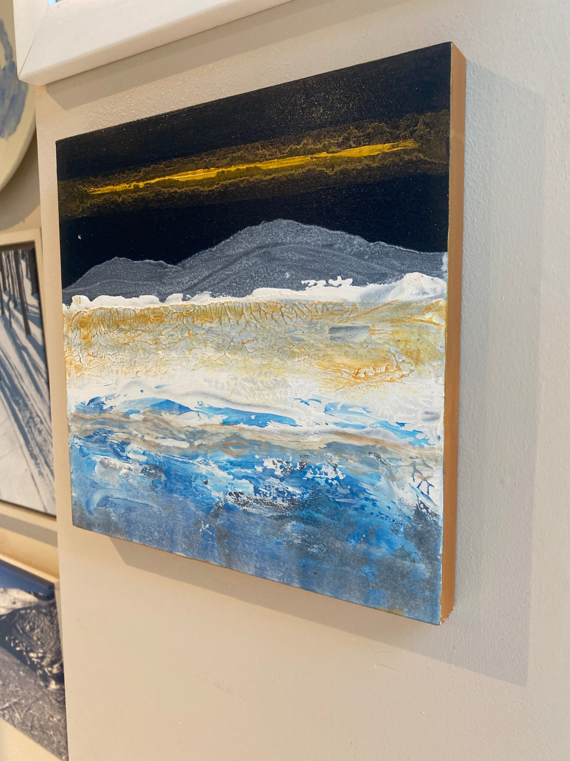 The feeling of crisp days in the mountains & lakes. Textured acrylic on wooden block with gold edges. 20cm x 20cm - 1.5cm deep.