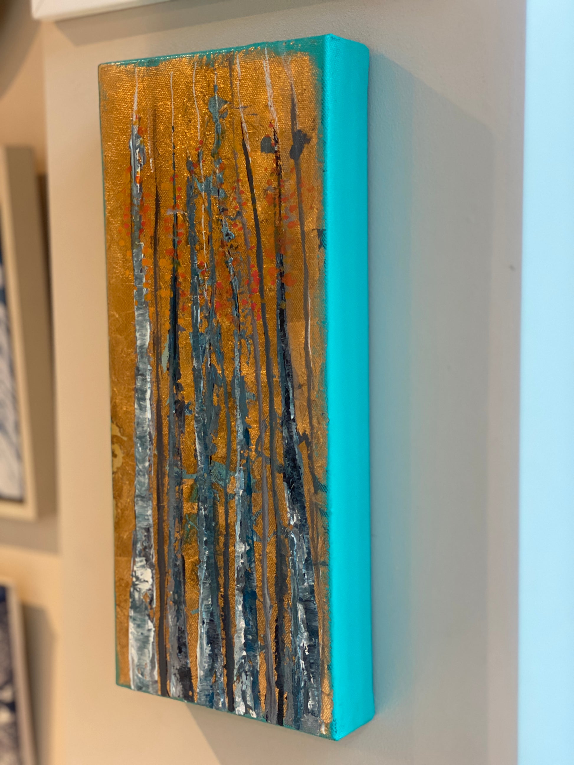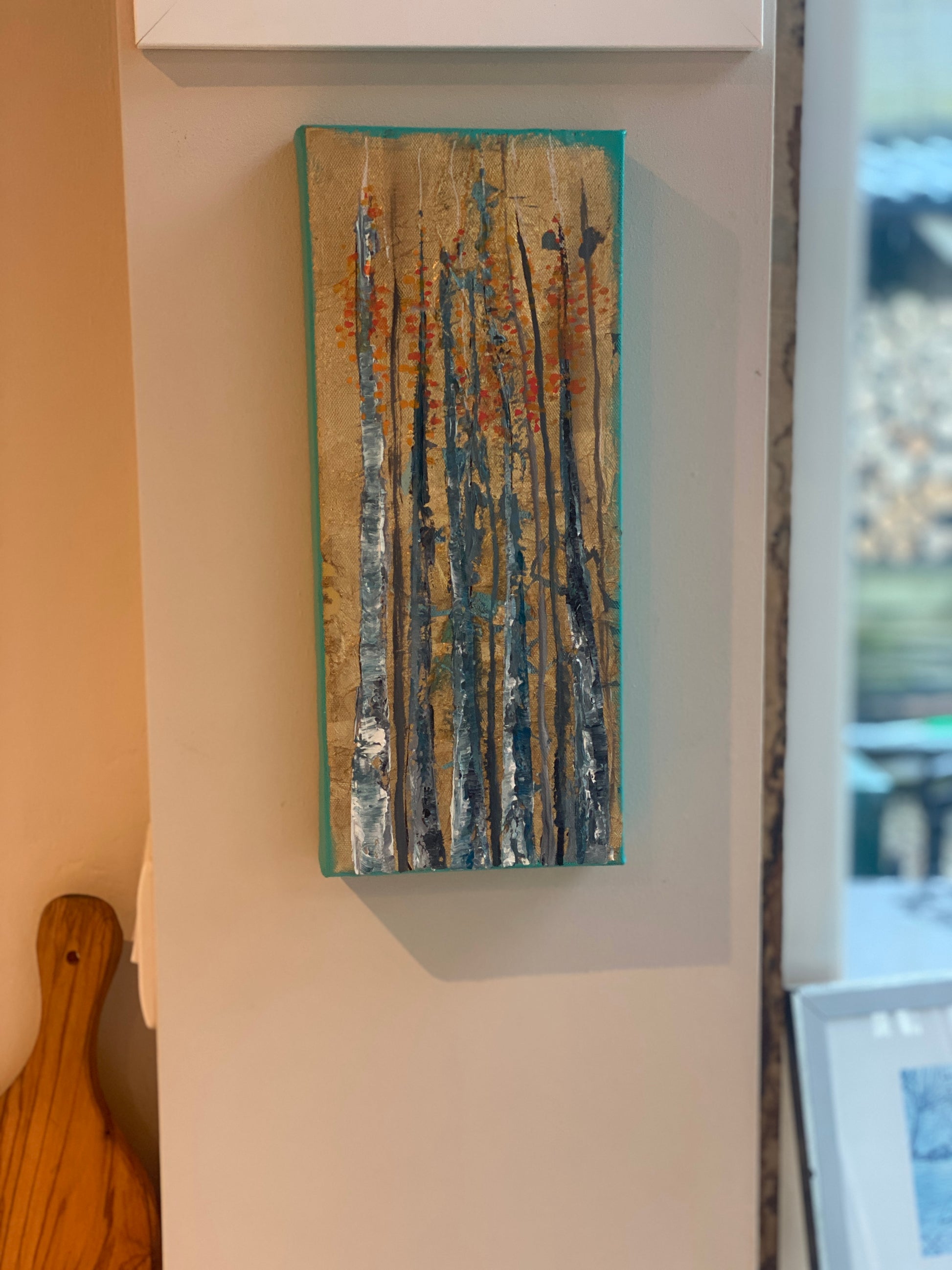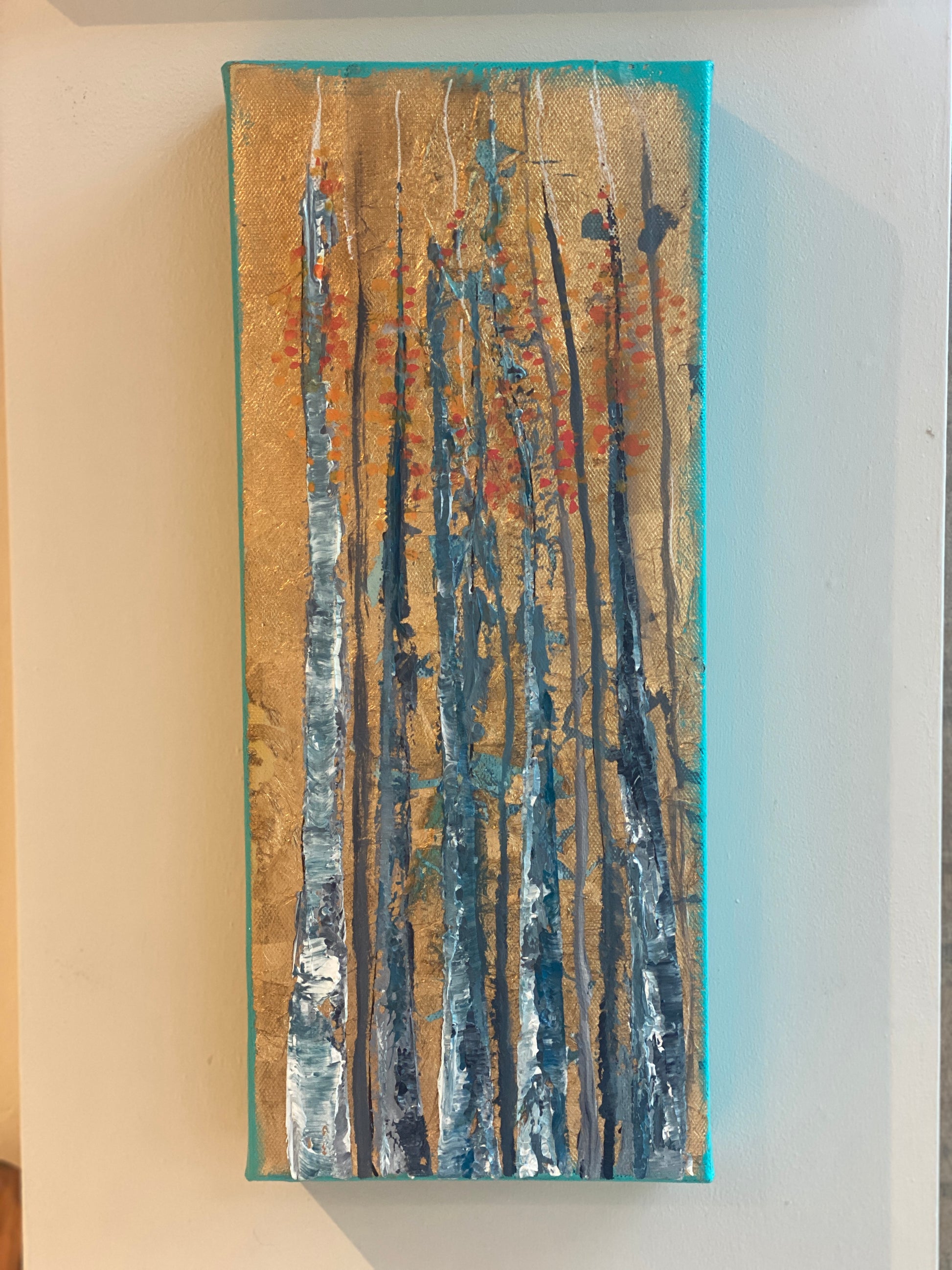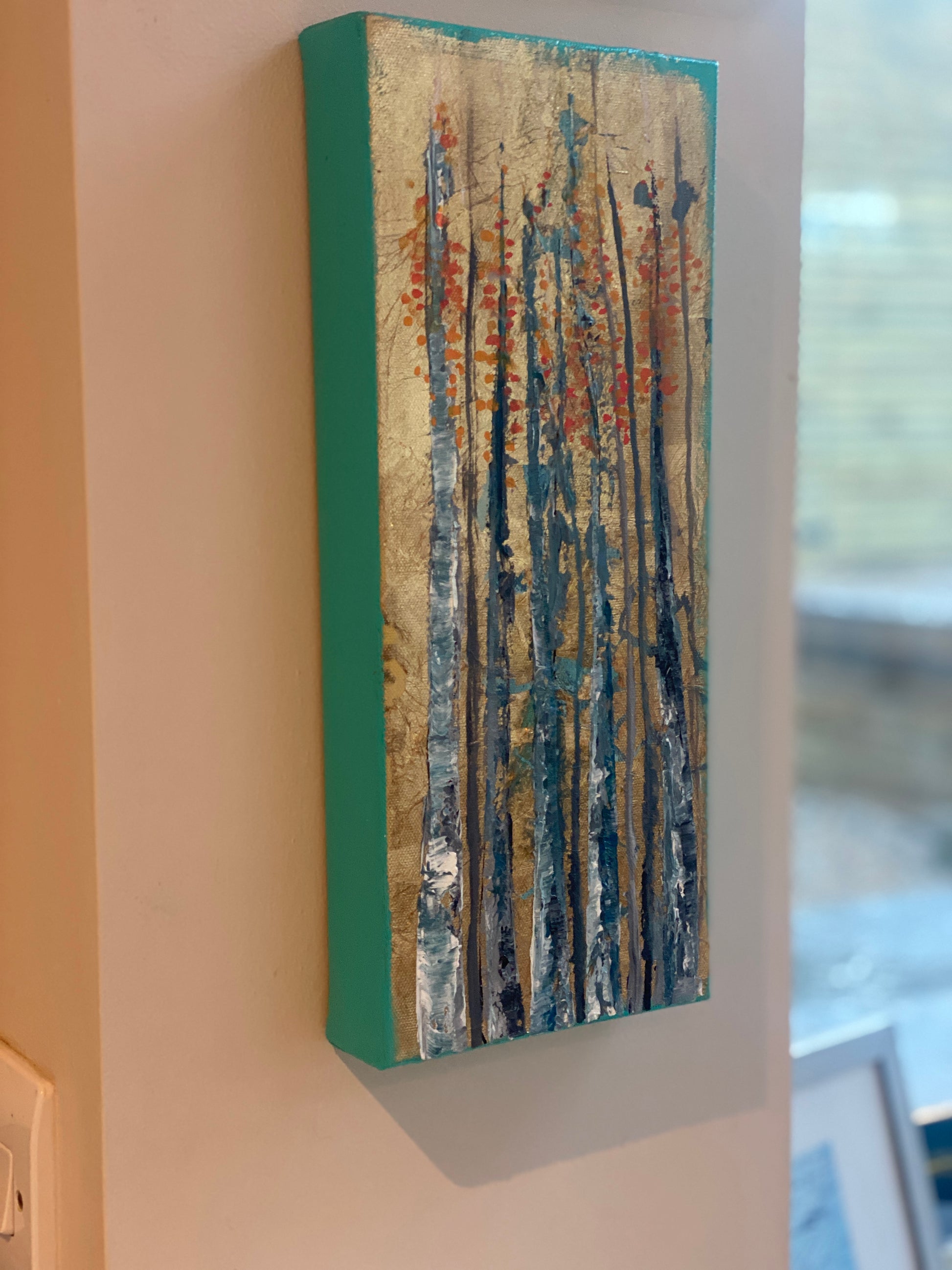 Silver birch are art in themselves - how they stand out in nature like they have been painted into the landscape. This small, long representation is a feeling of how I feel silver birch glow in autumnal light. Acrylic & gold leaf on repurposed small block canvas. 33cm high, 14cm wide, 4cm block depth.