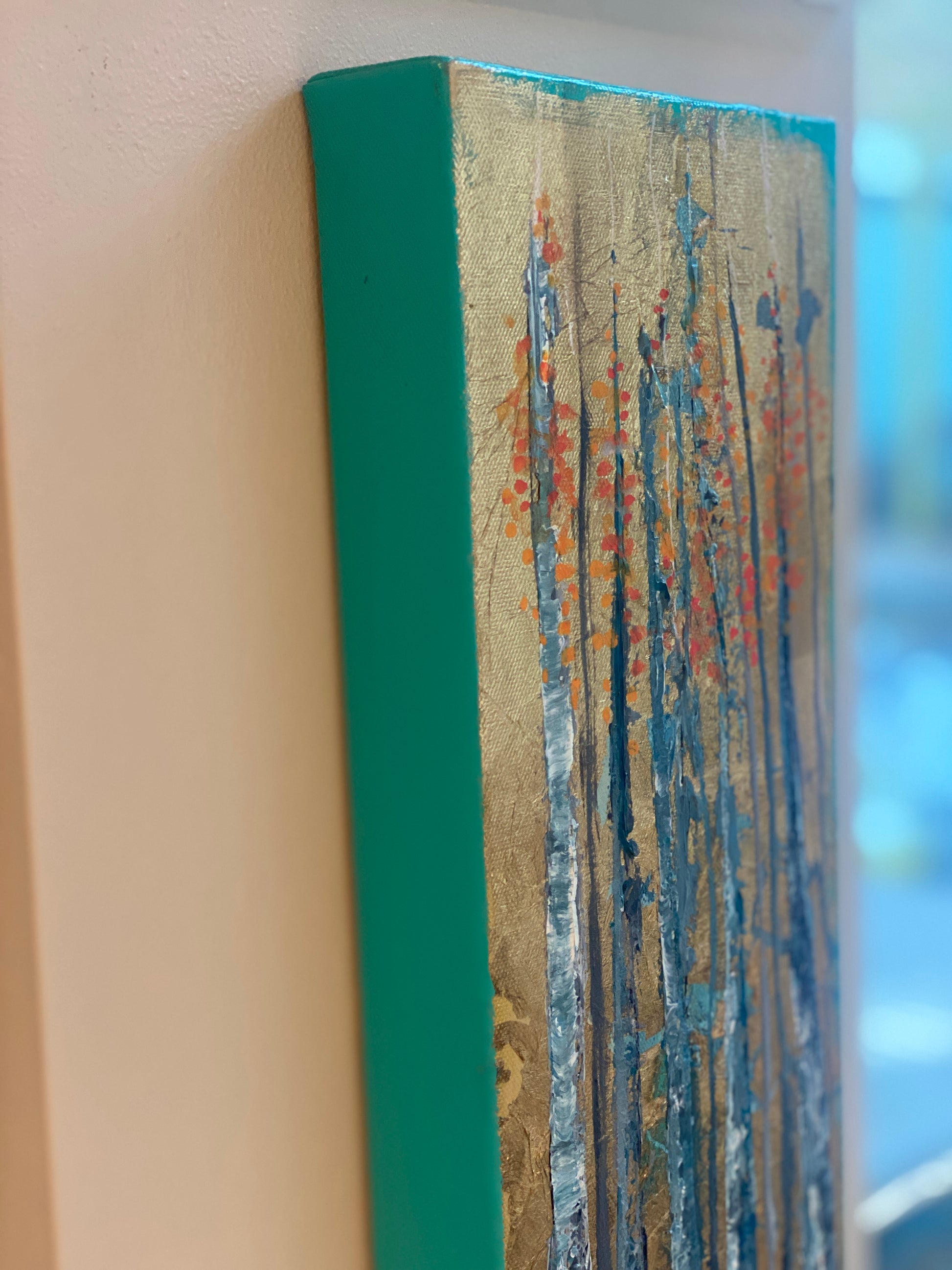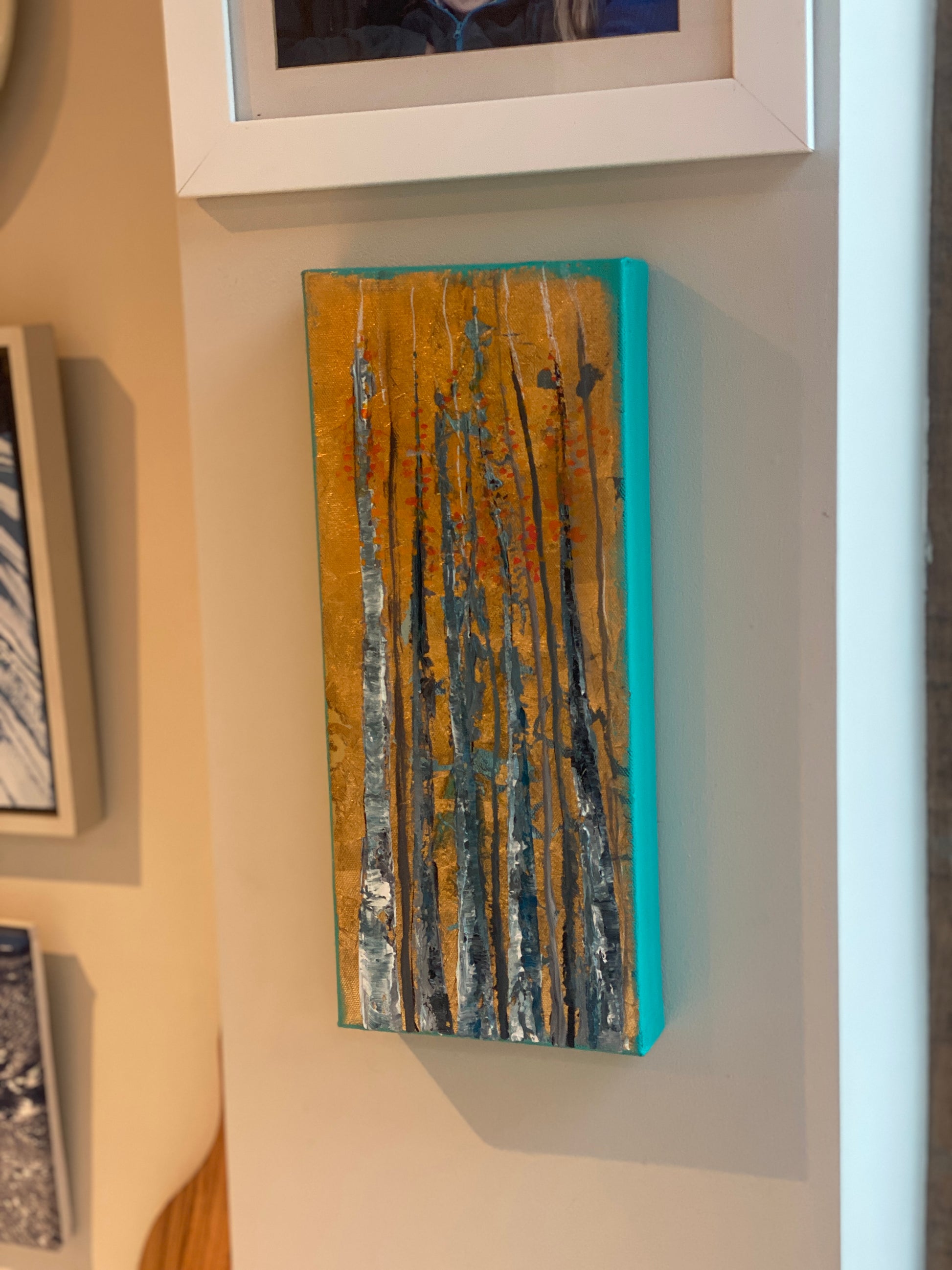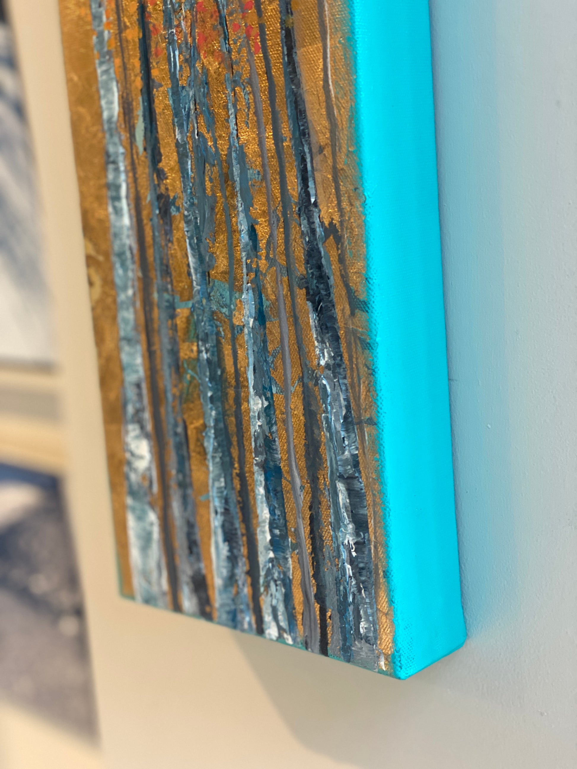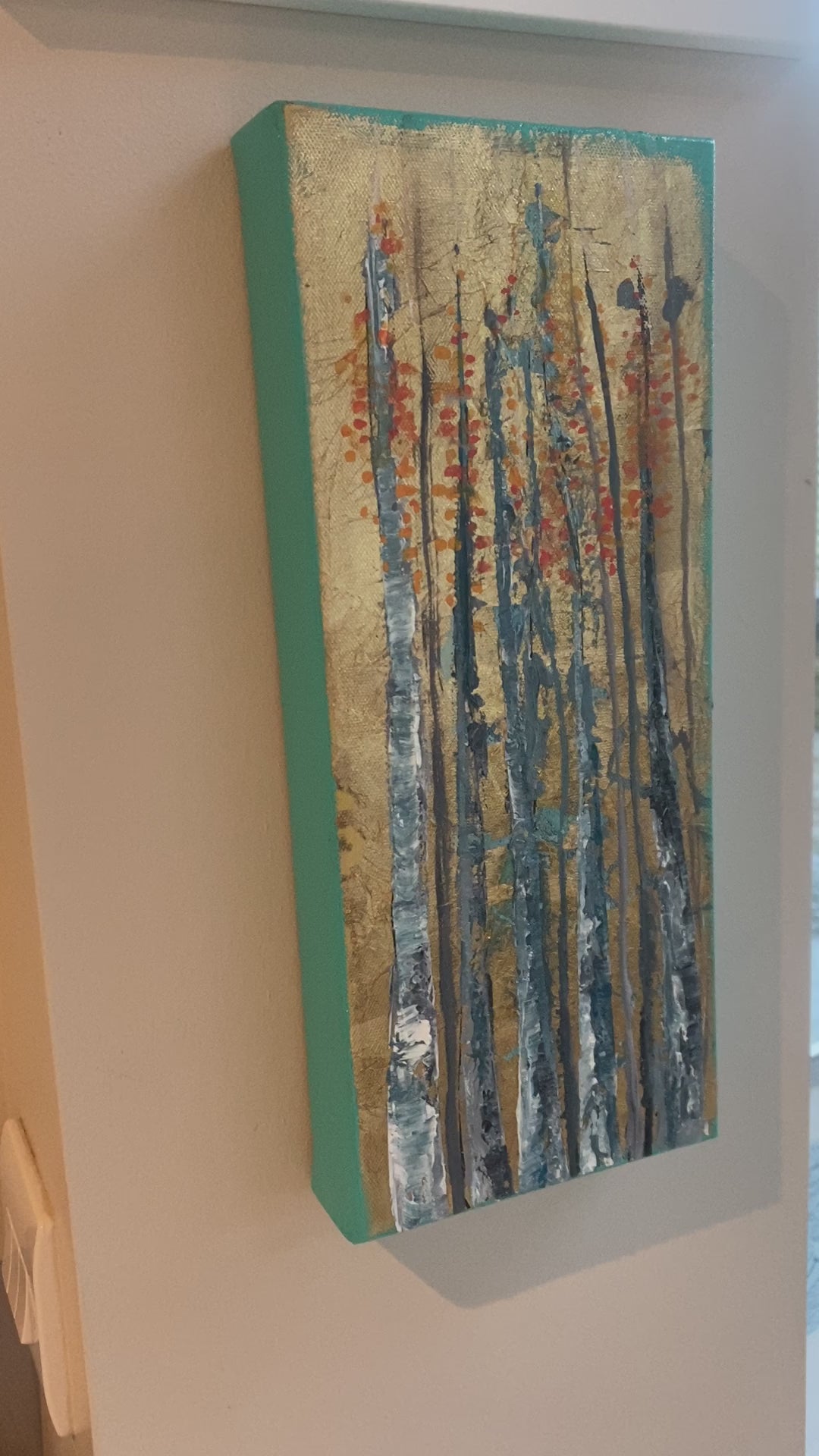Silver birch are art in themselves - how they stand out in nature like they have been painted into the landscape. This small, long representation is a feeling of how I feel silver birch glow in autumnal light. Acrylic & gold leaf on repurposed small block canvas. 33cm high, 14cm wide, 4cm block depth.